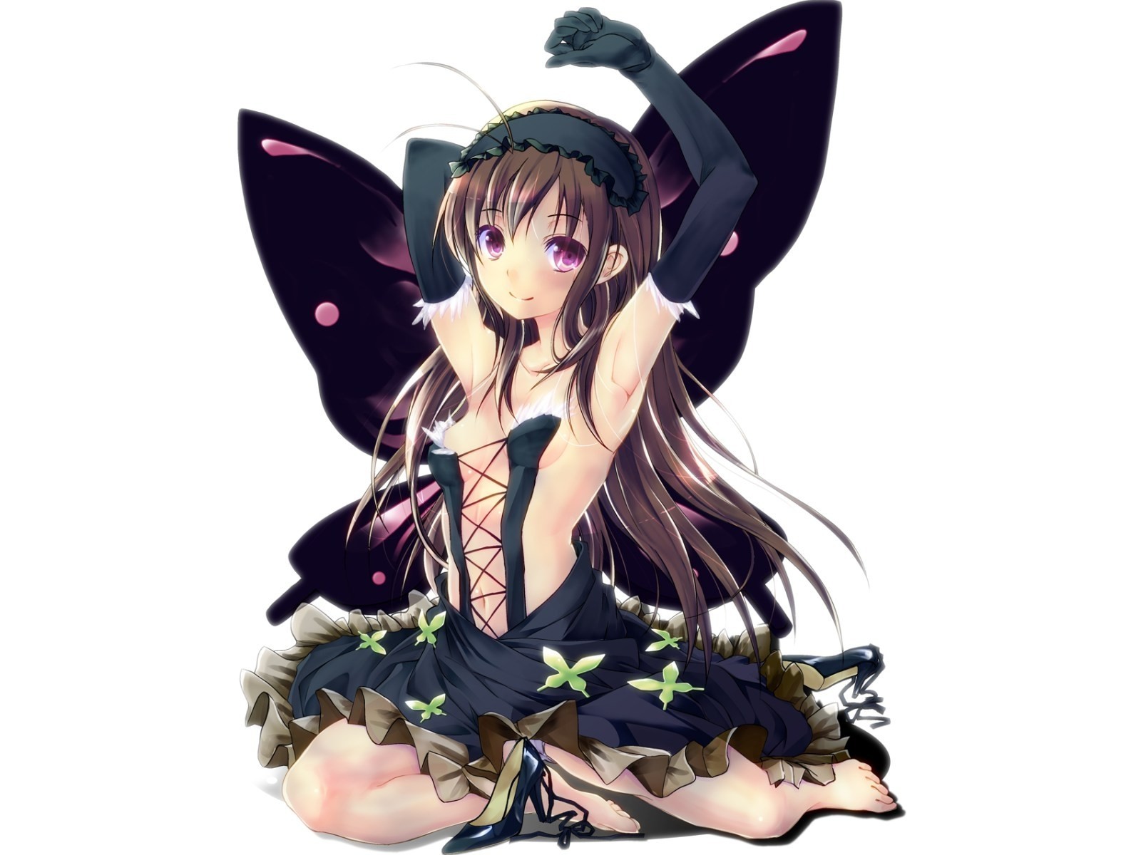 Kennungen:hintergrundbeleuchtung, barfuß, langes haar, lila augen, weiß, anziehen, flügel, braune haare