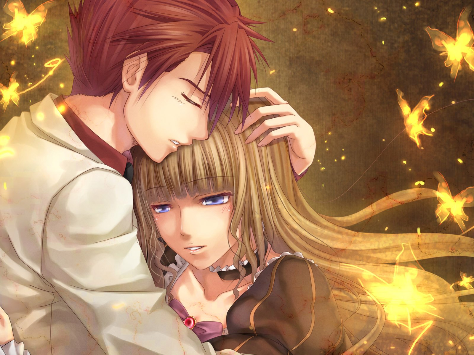 Umarmung des Anime-Paares unter goldenen Schmetterlingen - desktop-Hintergrund