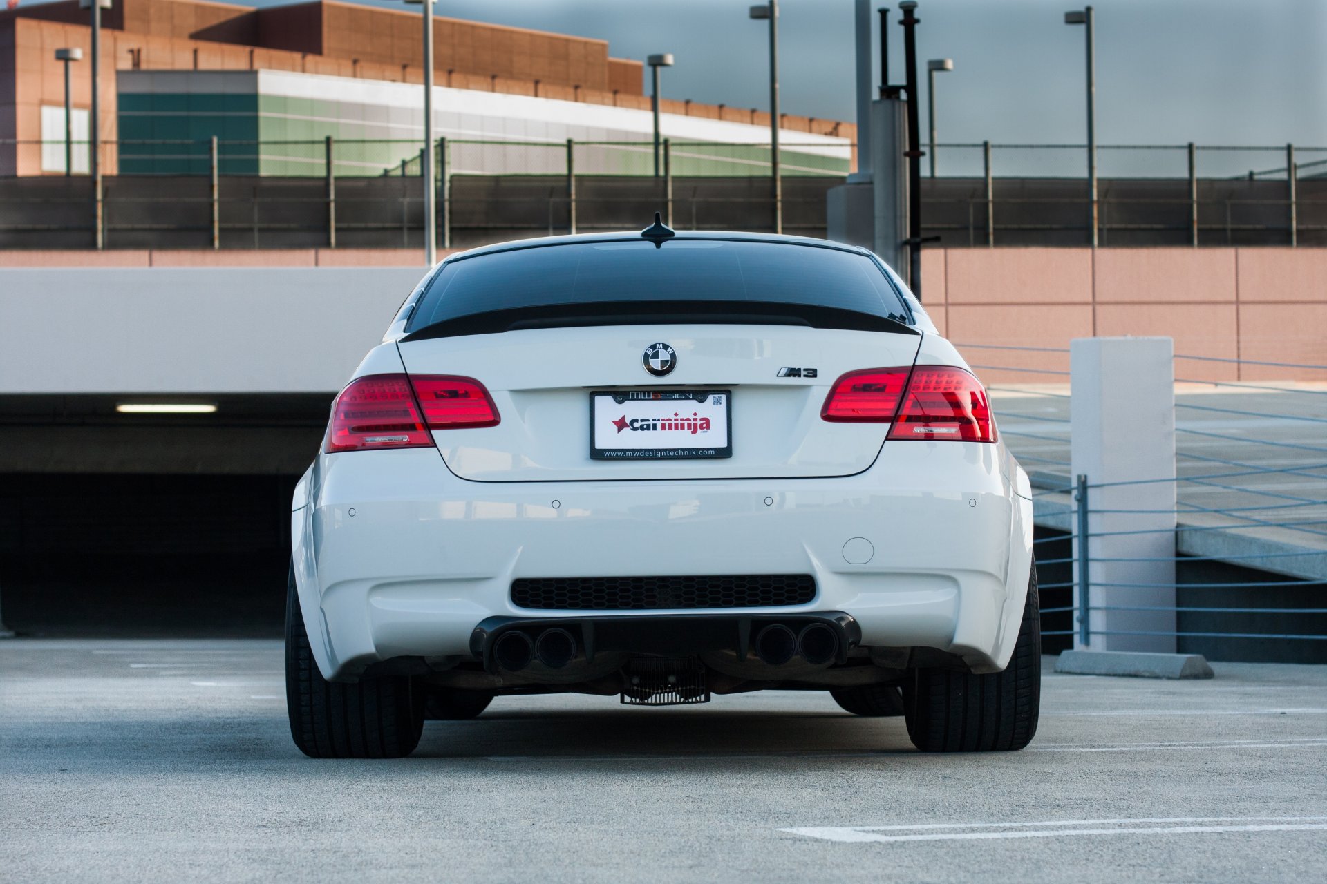 bmw m3 e92 weiß parkplatz bmw hinten markierung geländer lichter