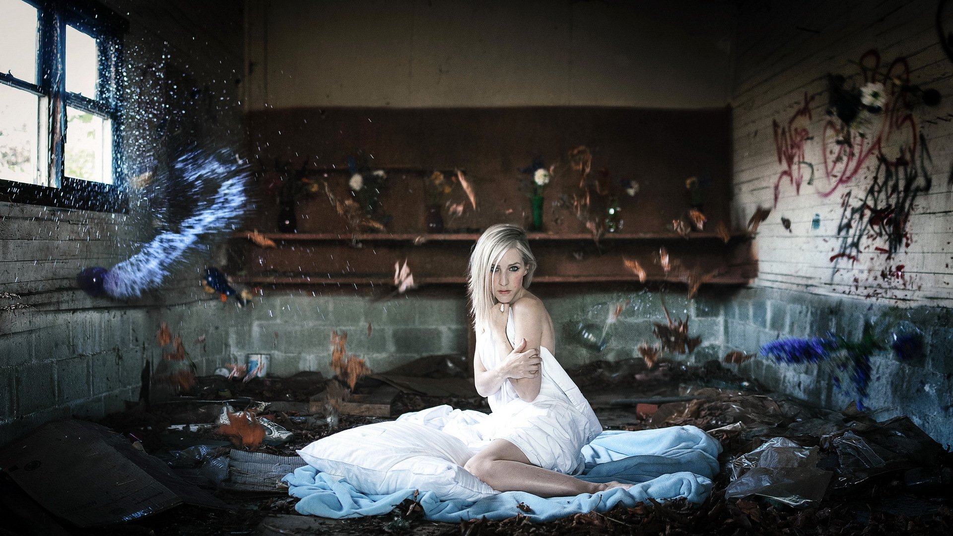 Mädchen in einem weißen Kleid in einem verlassenen Haus - desktop-Hintergrund