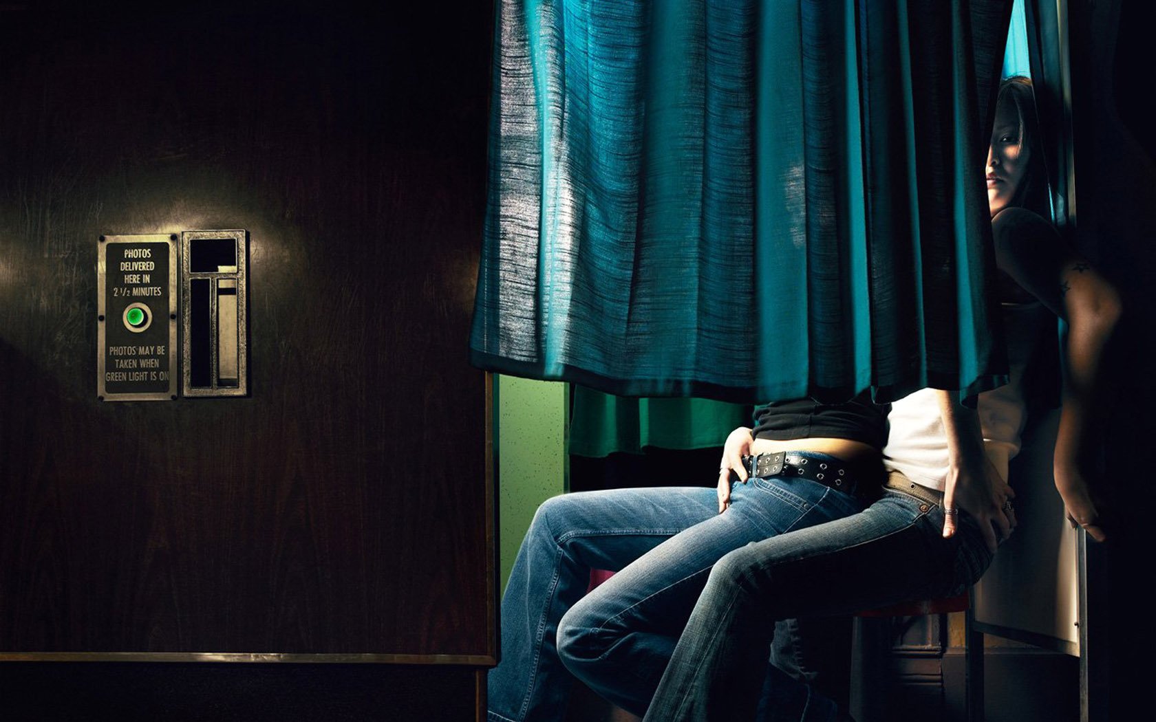 Mädchen sitzen in der Fotokabine - wallpaper für das Telefon