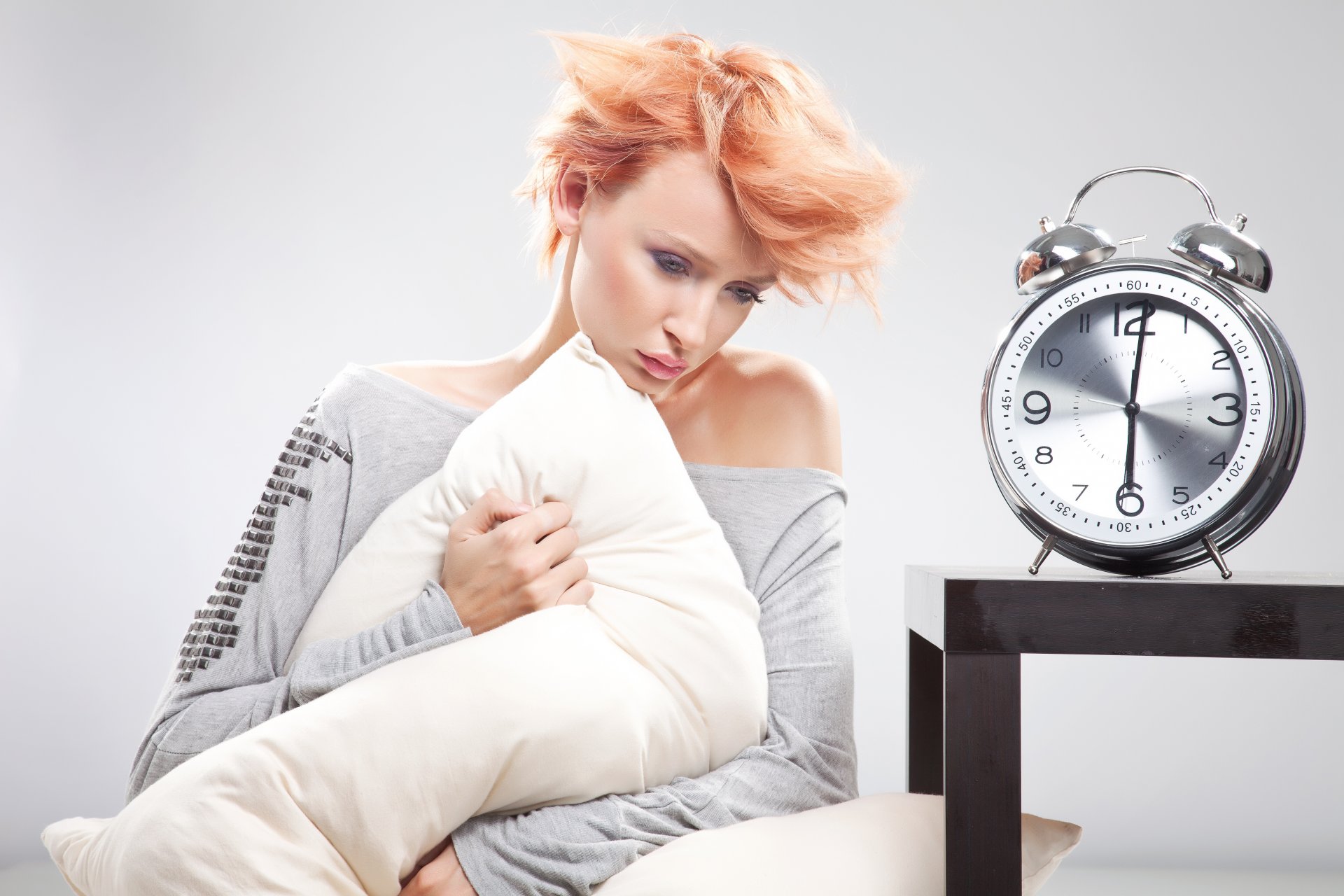 mädchen rotschopf schläfrig aufgeblasen kissen wecker sechs uhr morgens