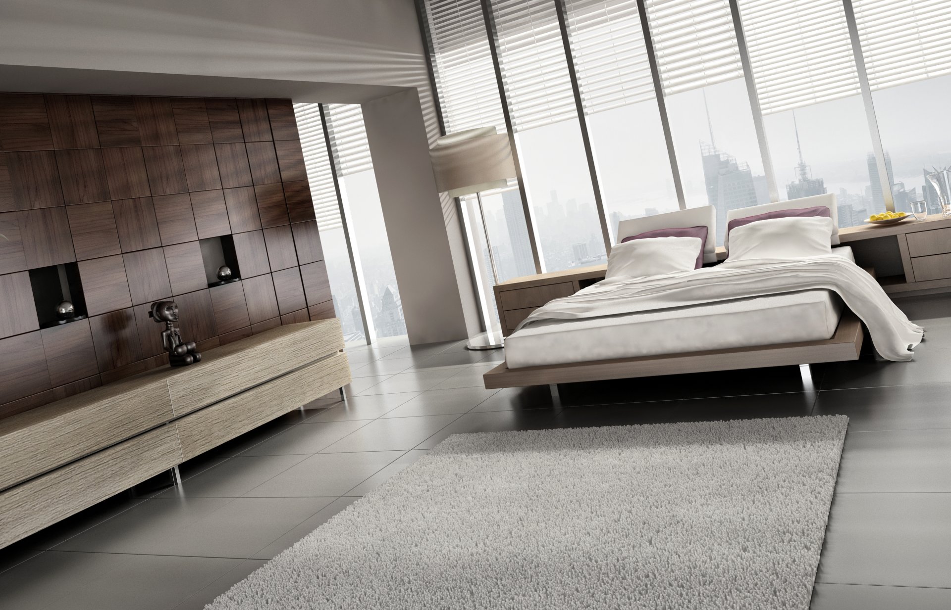 Stilvolles Interieur des Schlafzimmers mit Panoramafenstern - wallpaper für das Telefon