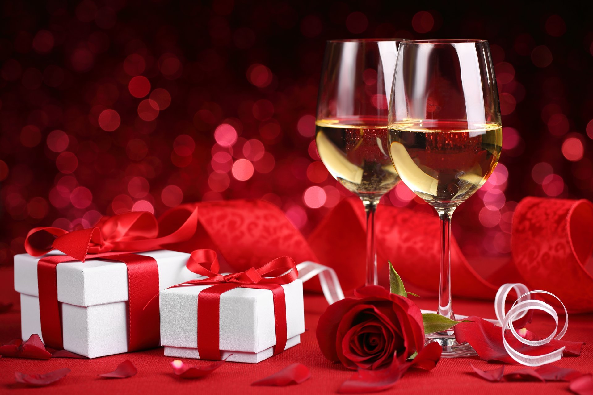 Sektgläser mit roter Rose und Geschenken - wallpaper für das Telefon