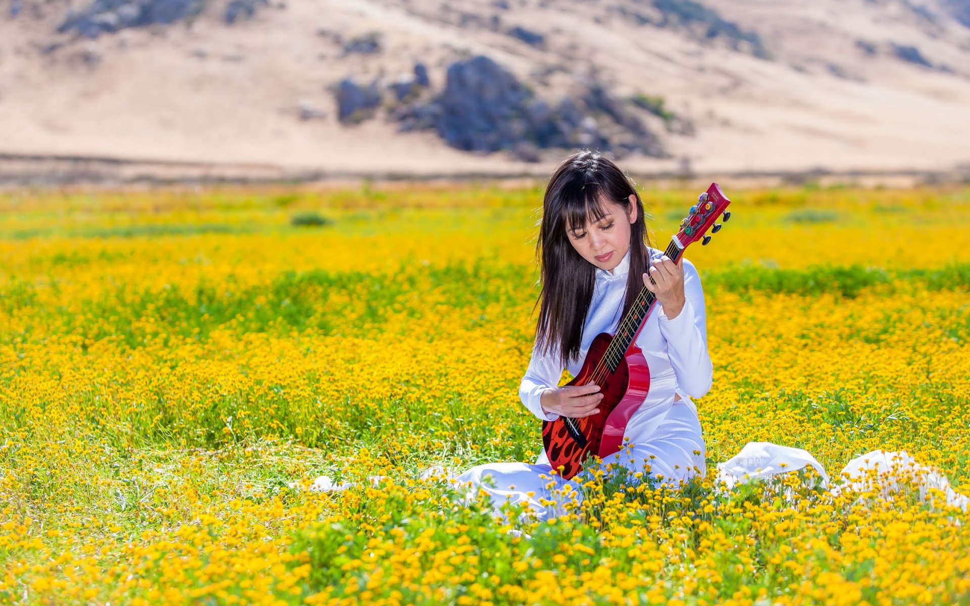 Mädchen mit roter Gitarre im Feld - desktop-Hintergrund