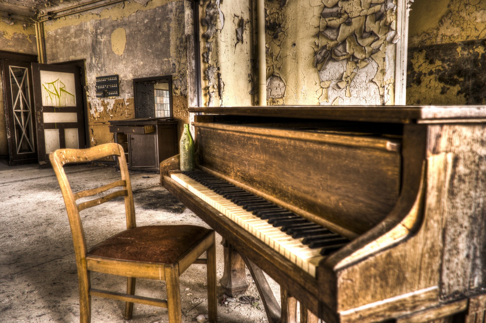 Ein baufälliges Klavier in einem verlassenen Gebäude - wallpaper für das Telefon