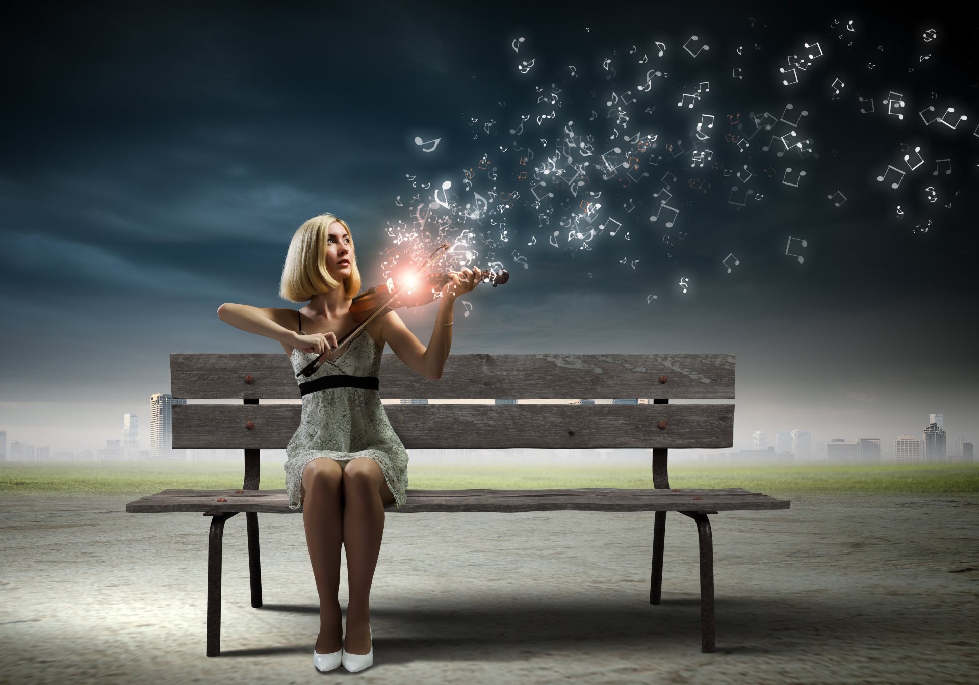 Mädchen mit Geige auf der Bank spielt - wallpaper für das Telefon