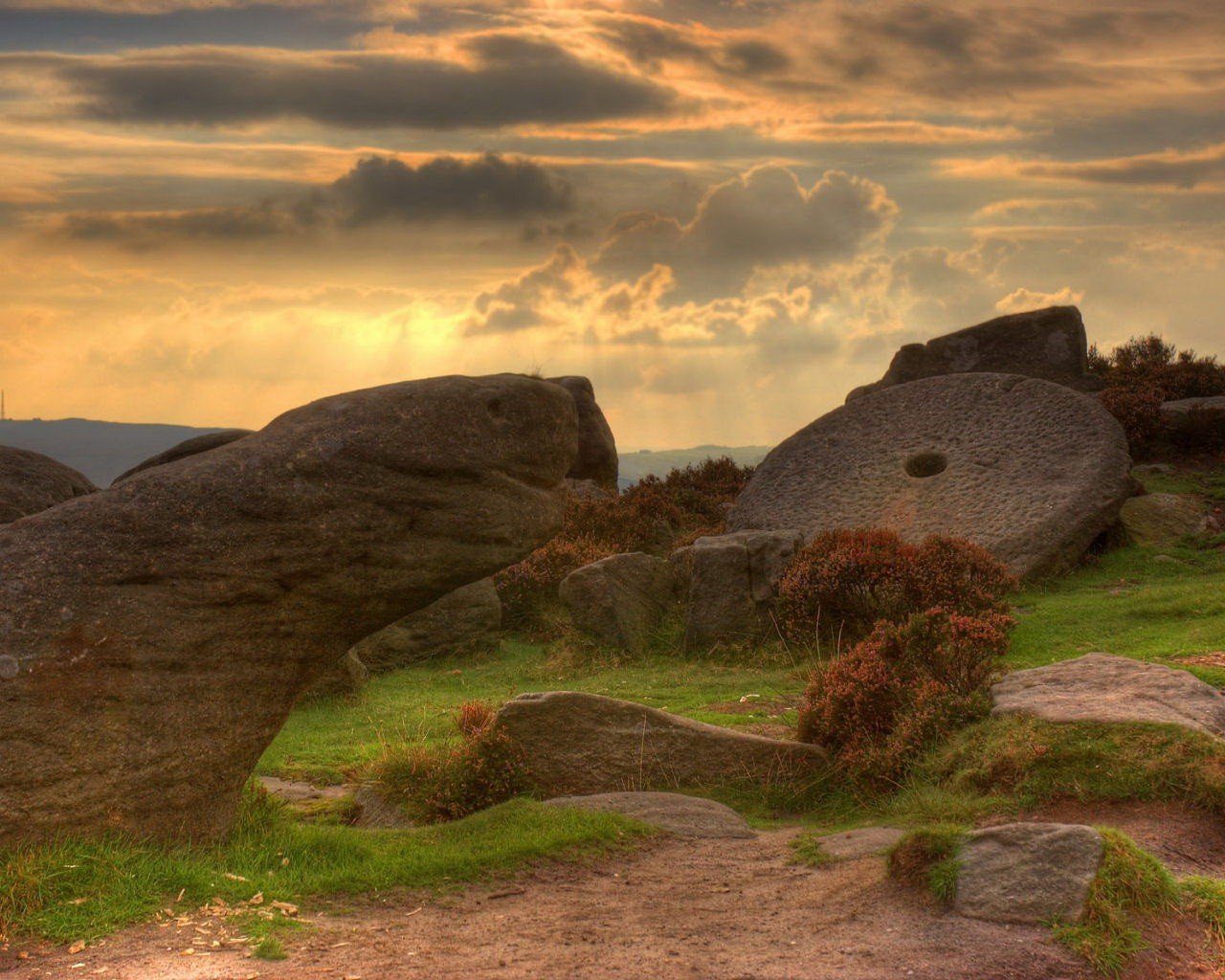 Große Felsbrocken auf einer grünen Wiese unter dichten Wolken - desktop-Hintergrund