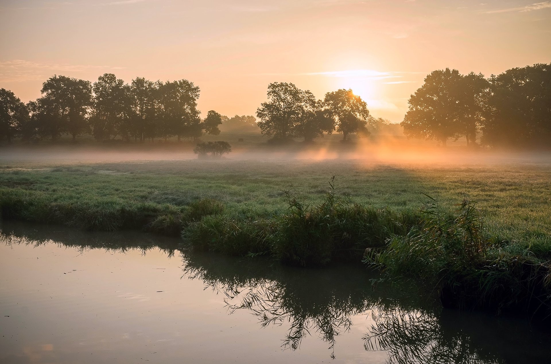 Kennungen:frühling, morgen, fluss, schilf, gras, tau, nebel, licht, sonne, sonne, strahlen, bäume