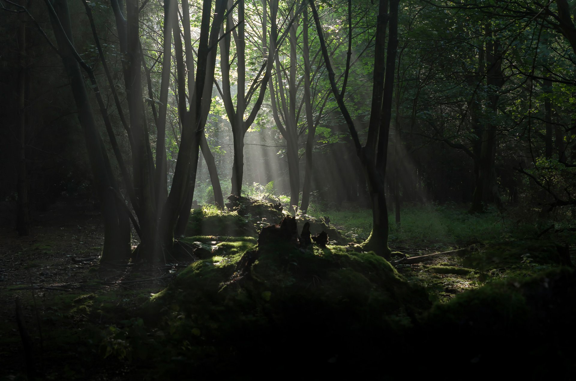 Der düstere Wald wird von den Sonnenstrahlen getroffen - wallpaper für das Telefon