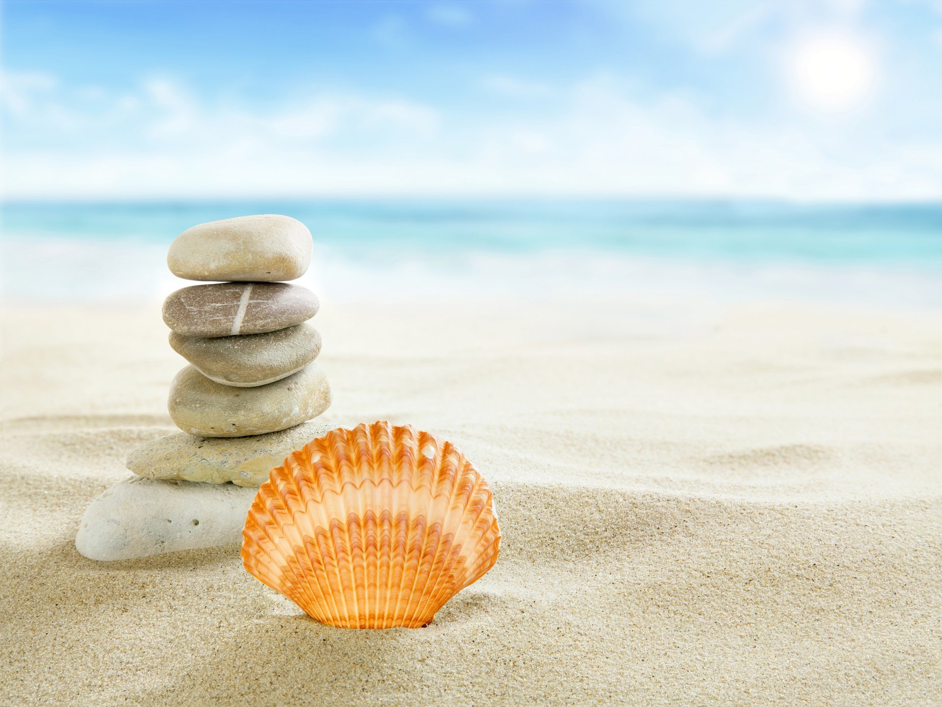 Meerstrandlandschaft mit Muscheln und Steinen - wallpaper für das Telefon