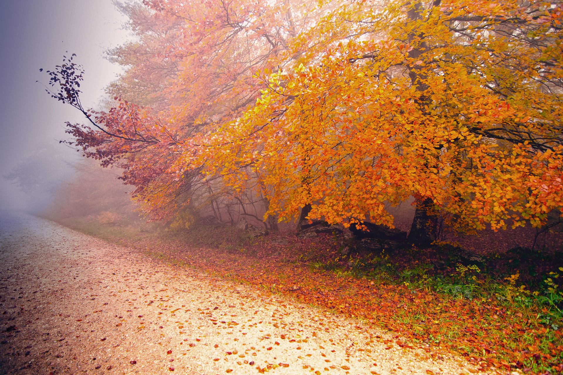 Neblige Herbstlandschaft mit Bäumen - wallpaper für das Telefon