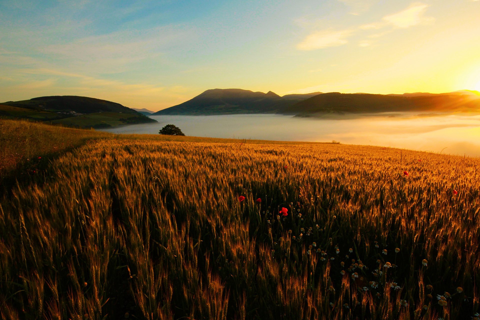 Kennungen:feld, blumen, landschaft, berge, himmel, sonne