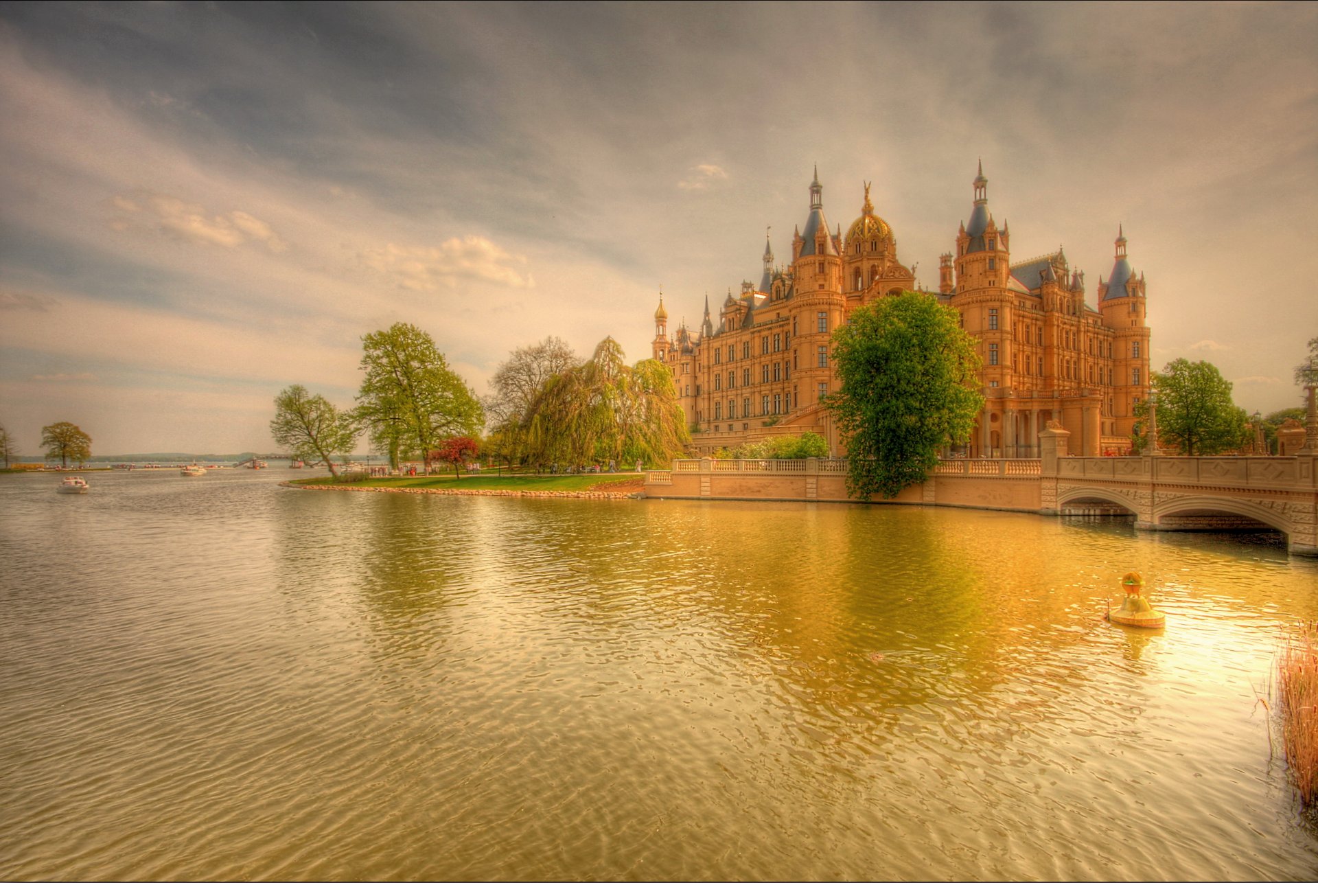 muster sonnenuntergang fluss brücke boote bäume schloss