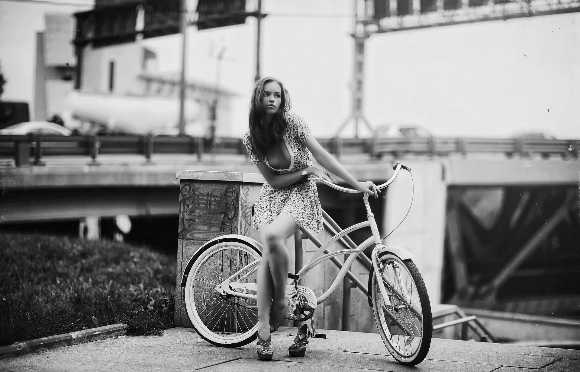 Mädchen mit einer schönen Figur auf einem Schwarz-Weiß-Fahrradfoto - desktop-Hintergrund