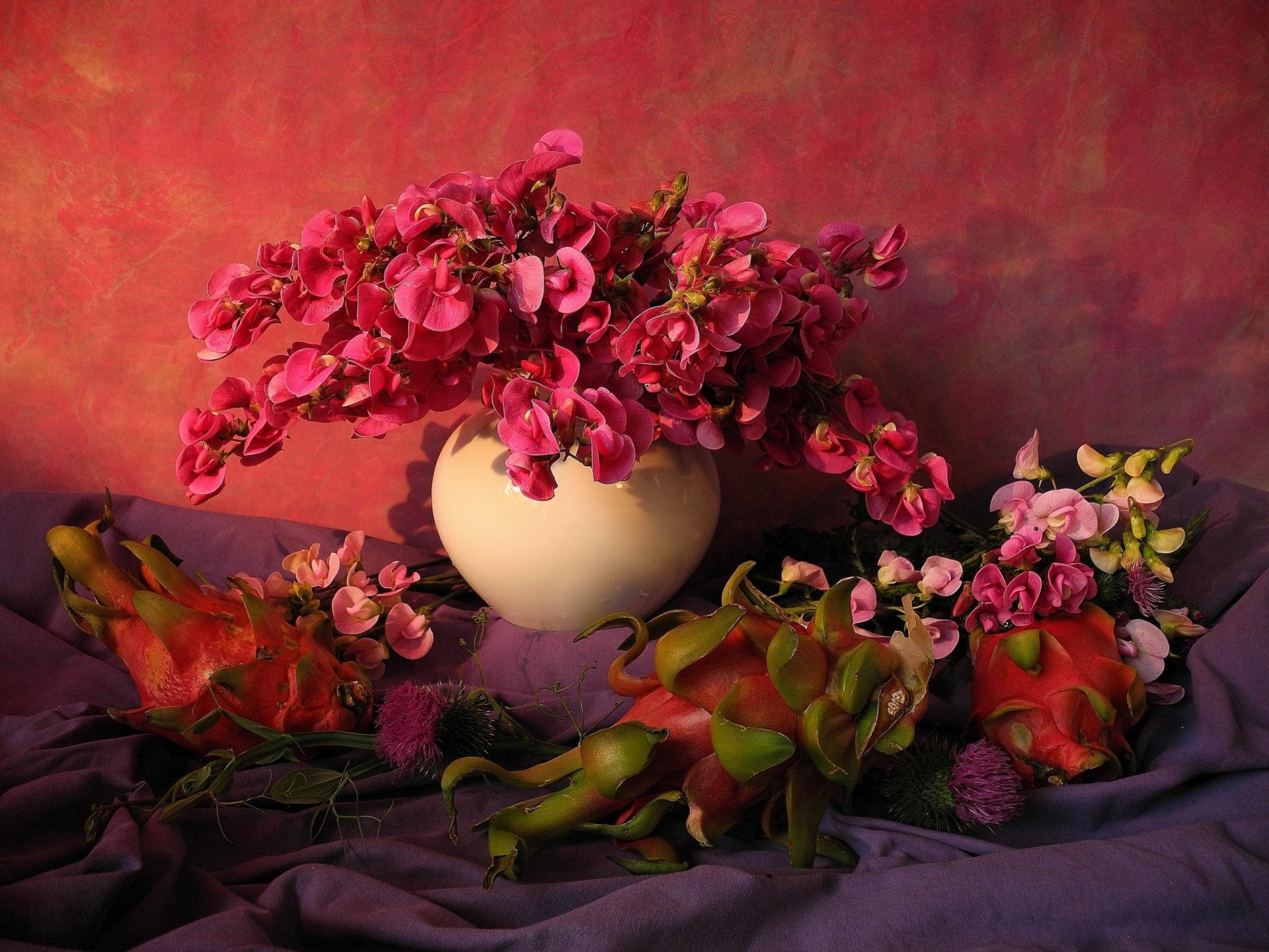 Stillleben mit Früchten und Blumen auf rotem Hintergrund - desktop-Hintergrund