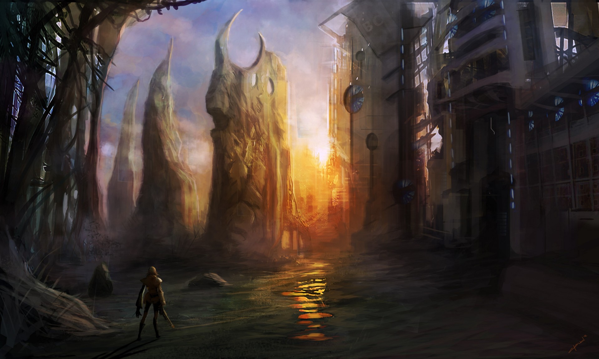 Eine fantastische Stadt und einen Menschen zeichnen - wallpaper für das Telefon