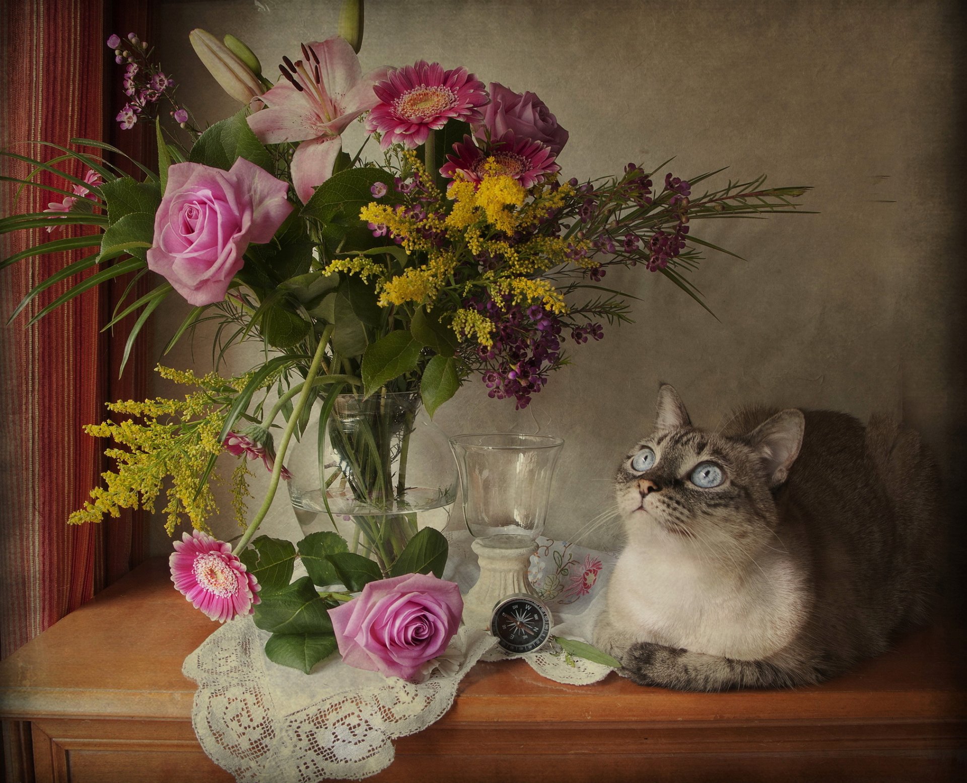 katze blumenstrauß rose blumen blick