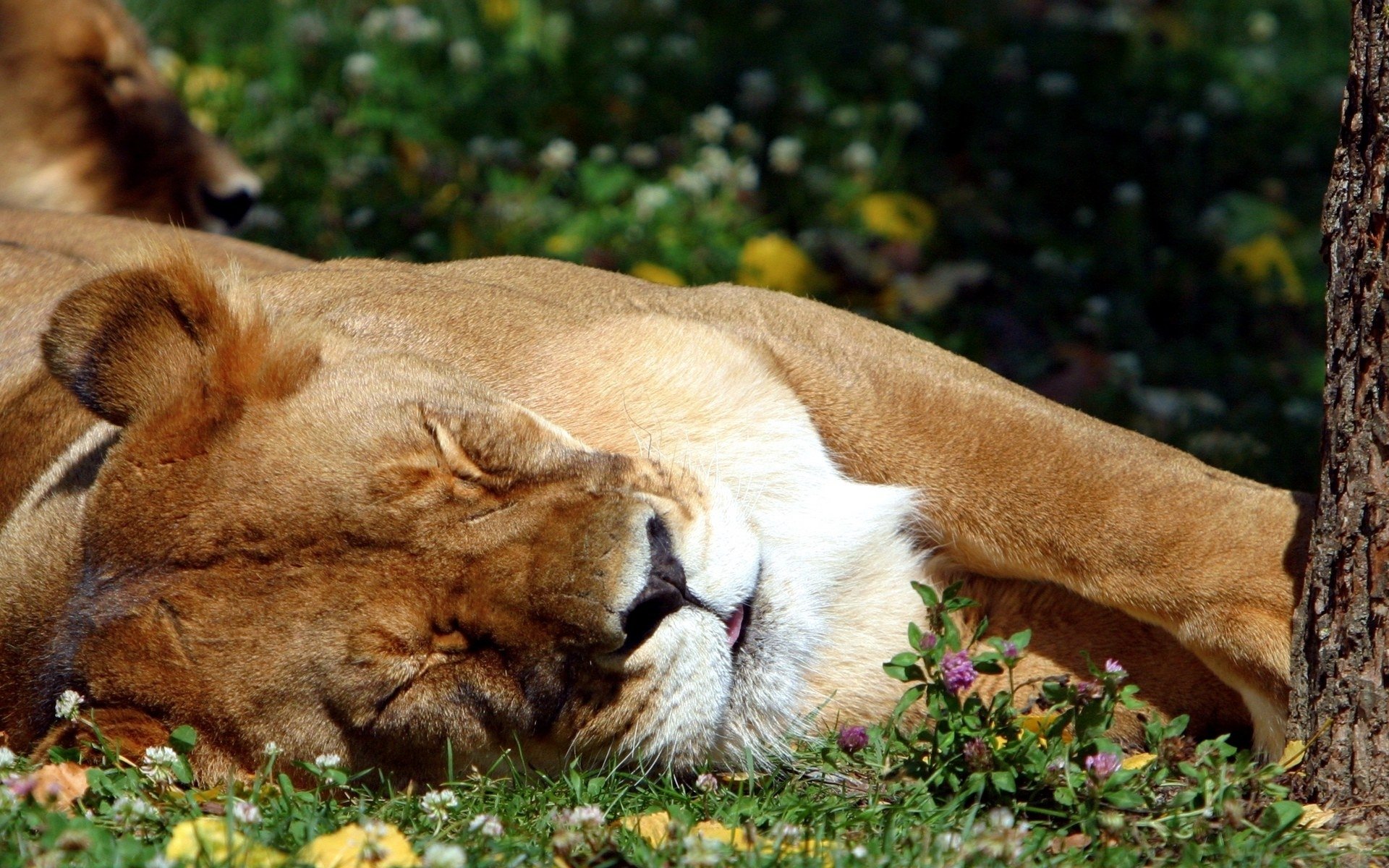 Löwin schläft auf grünem Gras - wallpaper für das Telefon