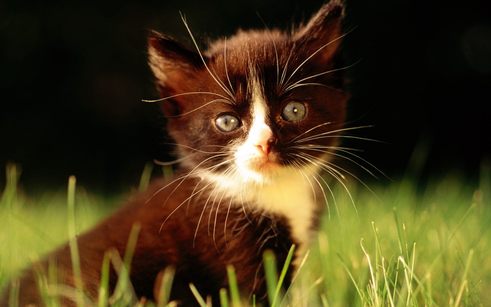Nahaufnahme eines schwarzen Kätzchens auf dem Gras - wallpaper für das Telefon