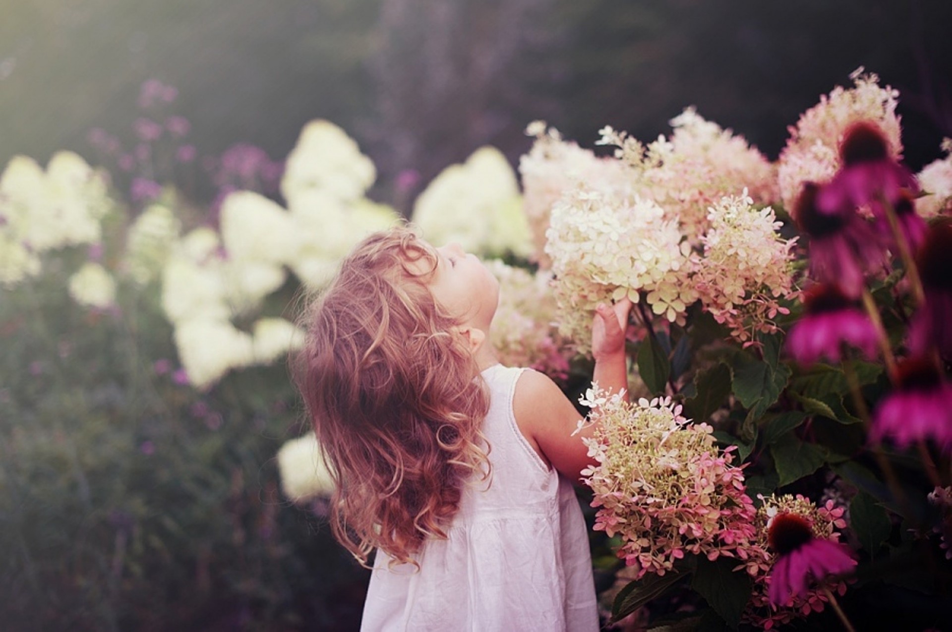 Süßes Mädchen schnüffelt Blumen. Inspirierendes Foto. Kinder sind die Blumen des Lebens. Mädchen im weißen Kleid in Blumen - wallpaper für das Telefon