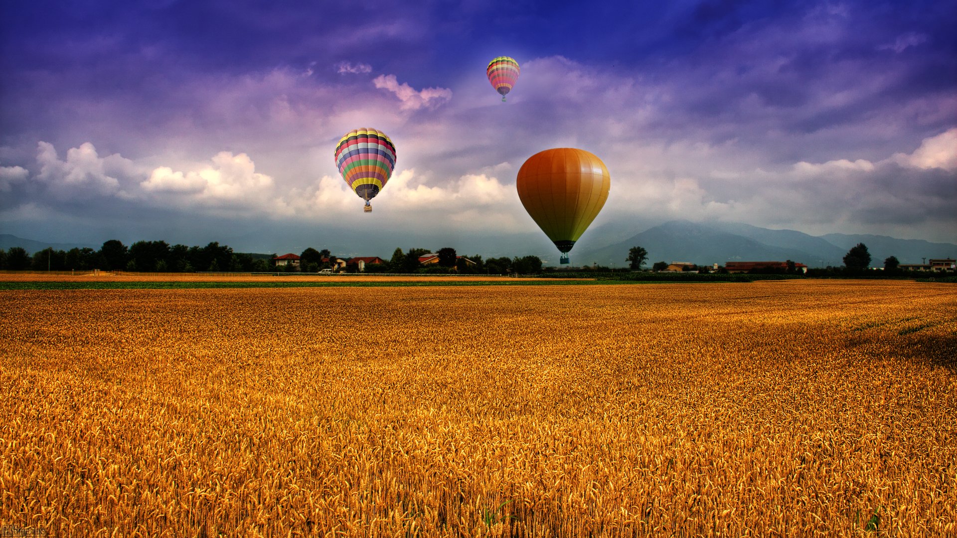Kennungen:feld, luftballons, himmel, wolken, berge, häuser, dorf
