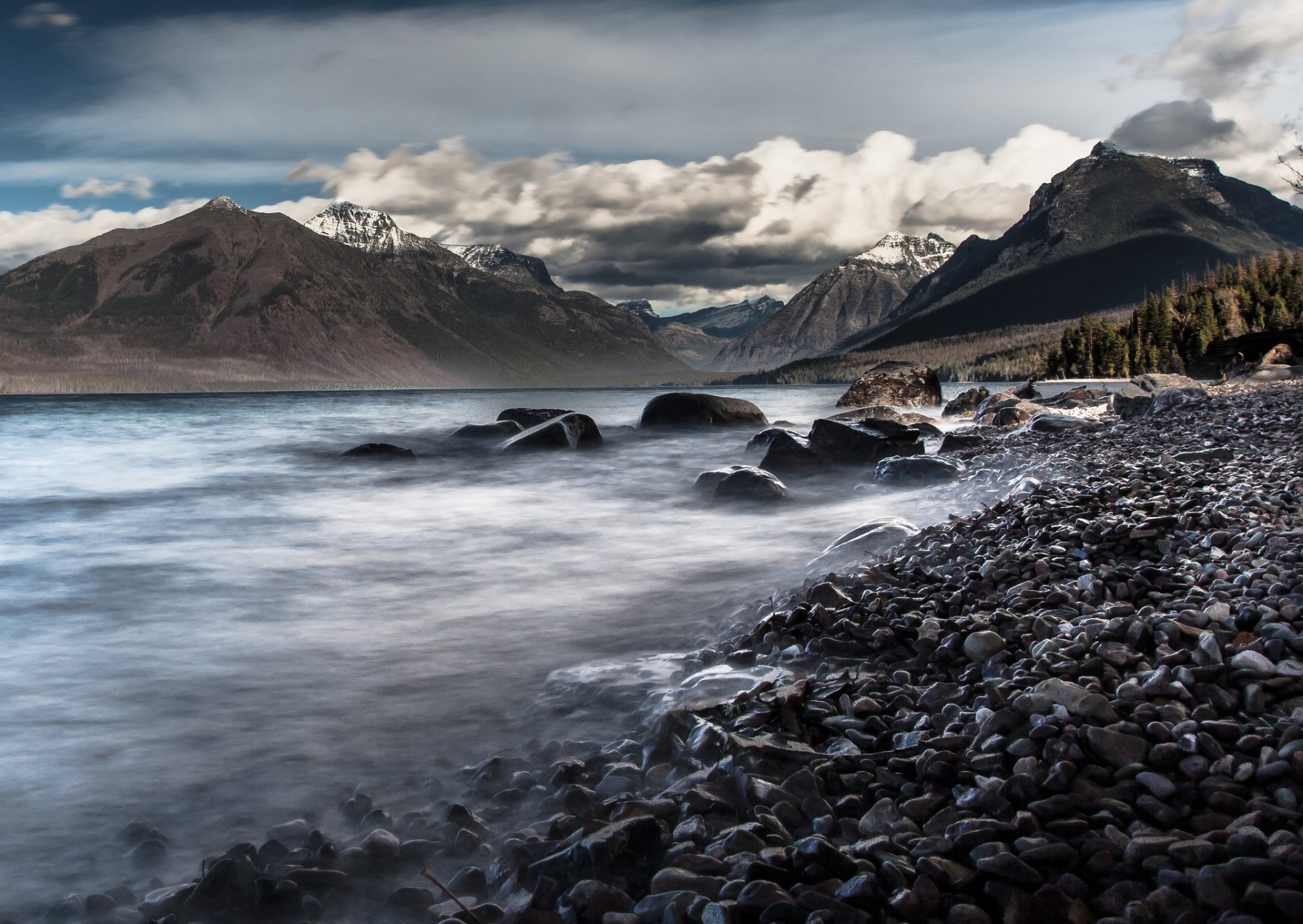 Bergsee mit schwarzen Steinen am Ufer - desktop-Hintergrund