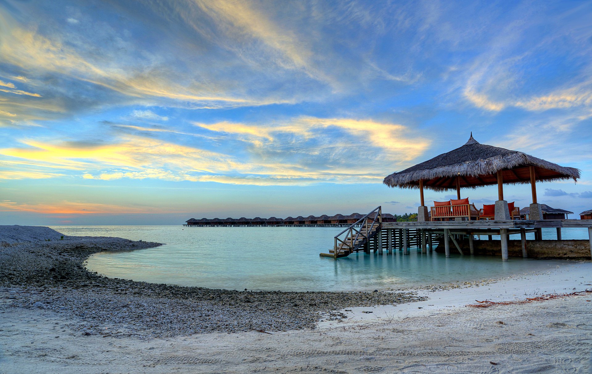 Kennungen:himmel, meer, abend, bungalow, malediven, wolken, küste, sand, steine, sonnenuntergang