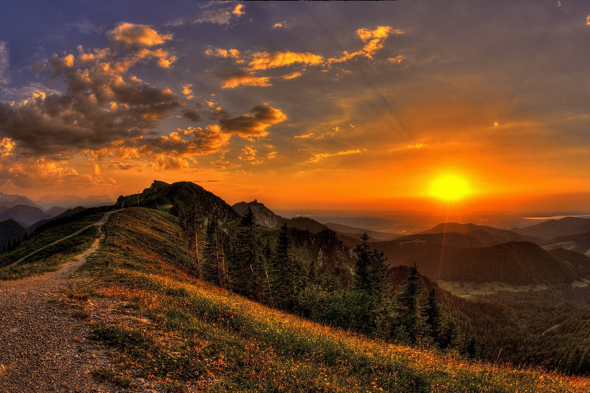 Kennungen:natur, sonnenuntergang, sonne, strahlen, ansicht, spur, berge, blumen, landschaft, gras, bäume, himmel, wolken