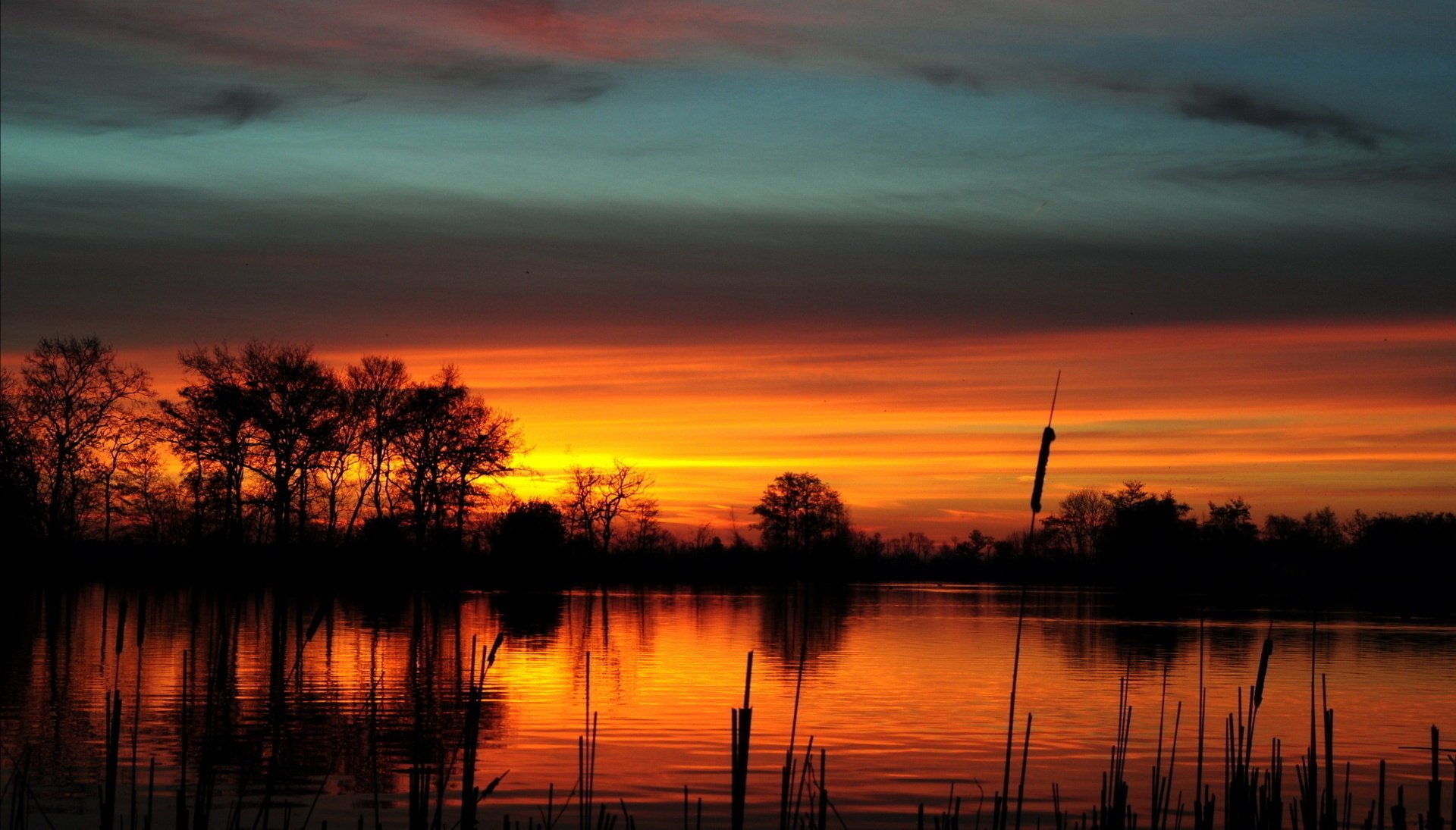Kennungen:see, teich, schilf, himmel, bäume, silhouetten, dämmerung, sonnenuntergang