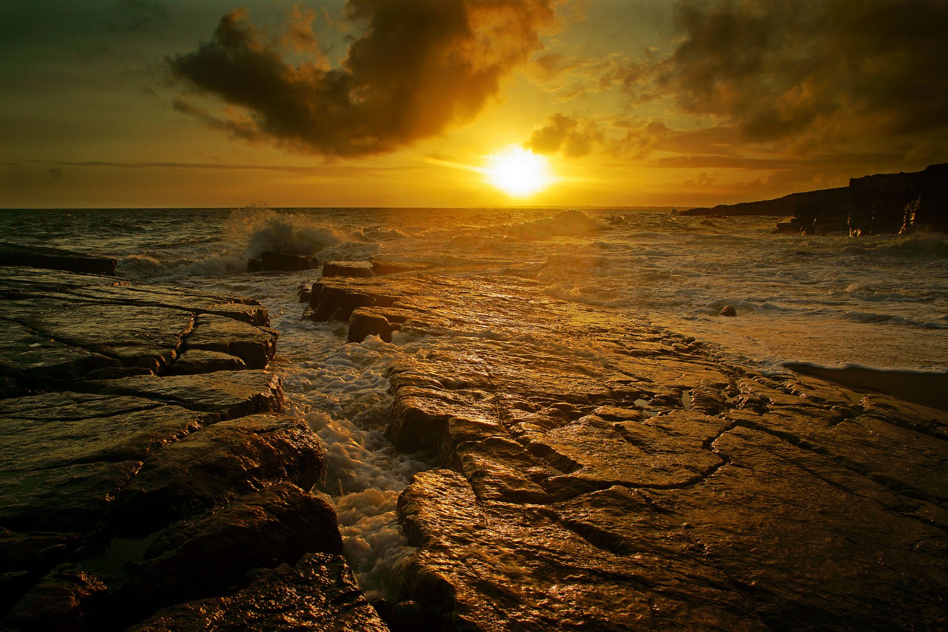 Kennungen:meer, steine, wellen, sonnenuntergang
