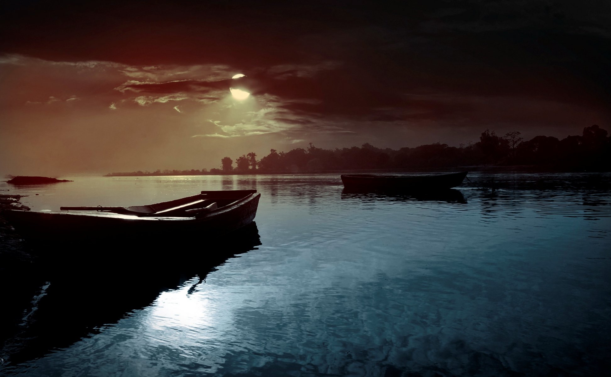 Kennungen:natur, landschaft, fluss, wasser, nacht, mond, himmel, wolken, boote