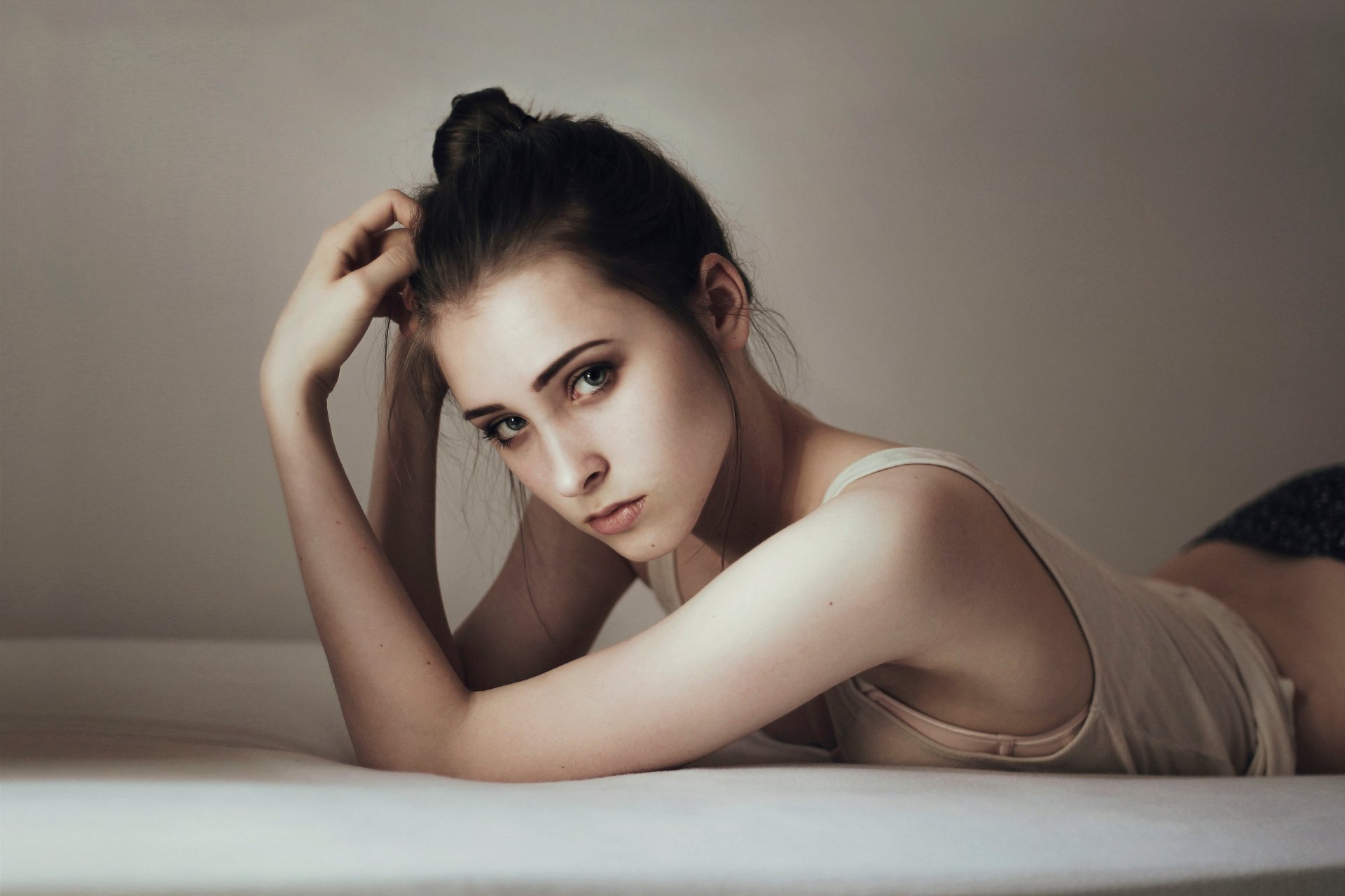 Ein Mädchen mit grünen Augen und braunen Haaren liegt in einer Gulka auf dem Bett - desktop-Hintergrund