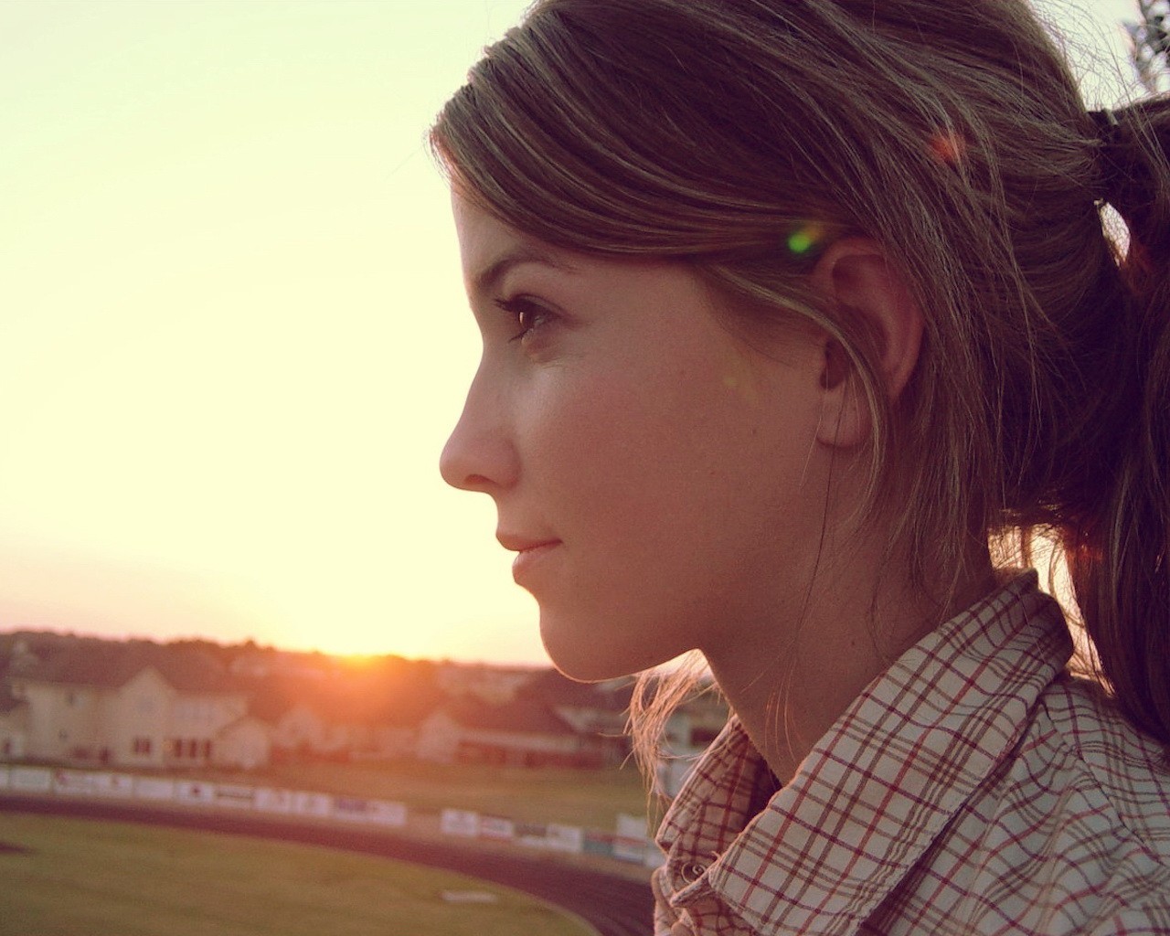 Mädchen im Profil auf Sonnenuntergang Hintergrund - wallpaper für das Telefon