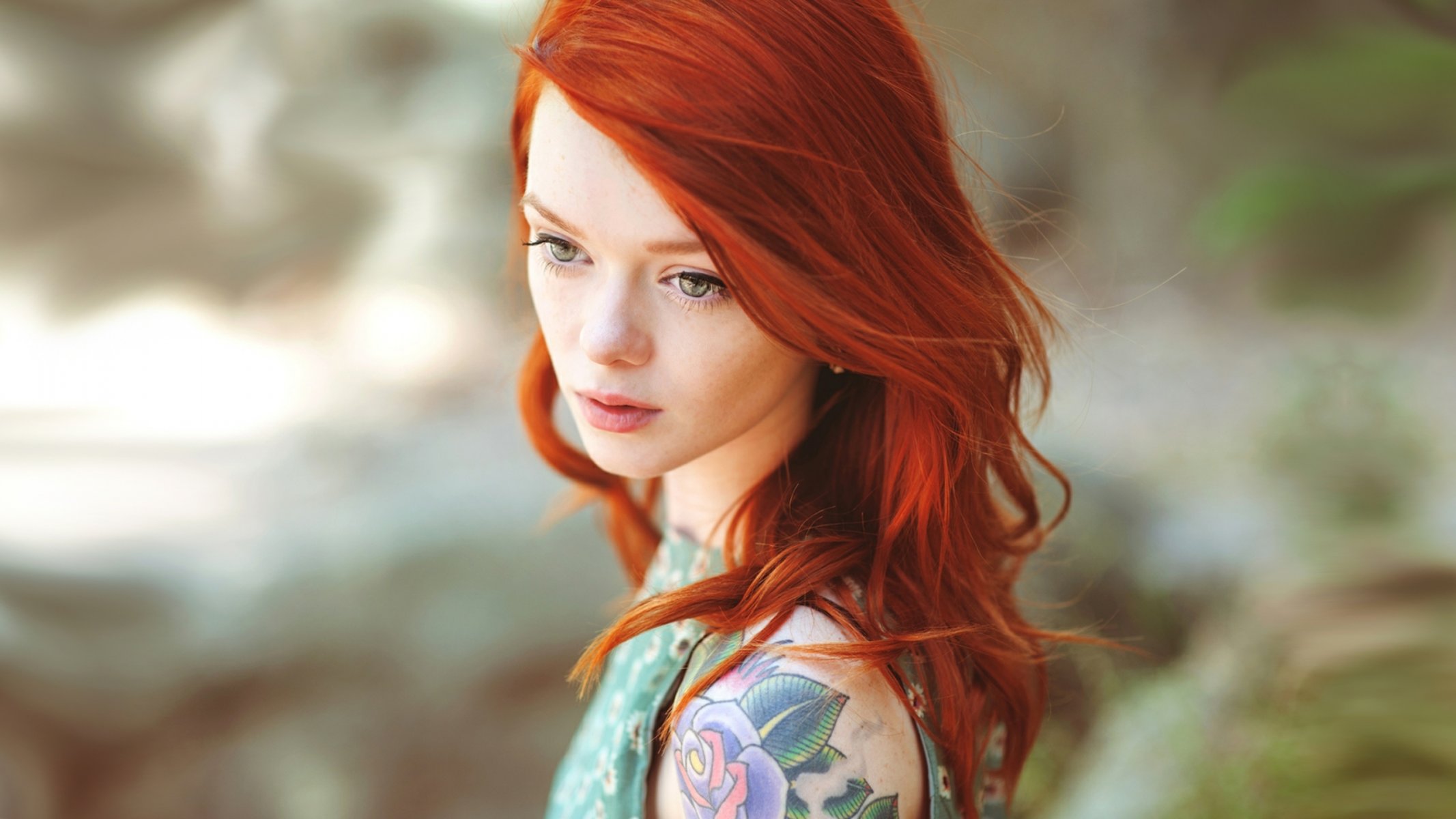 Rothaarige Schönheit mit einem Tattoo auf der Schulter - wallpaper für das Telefon