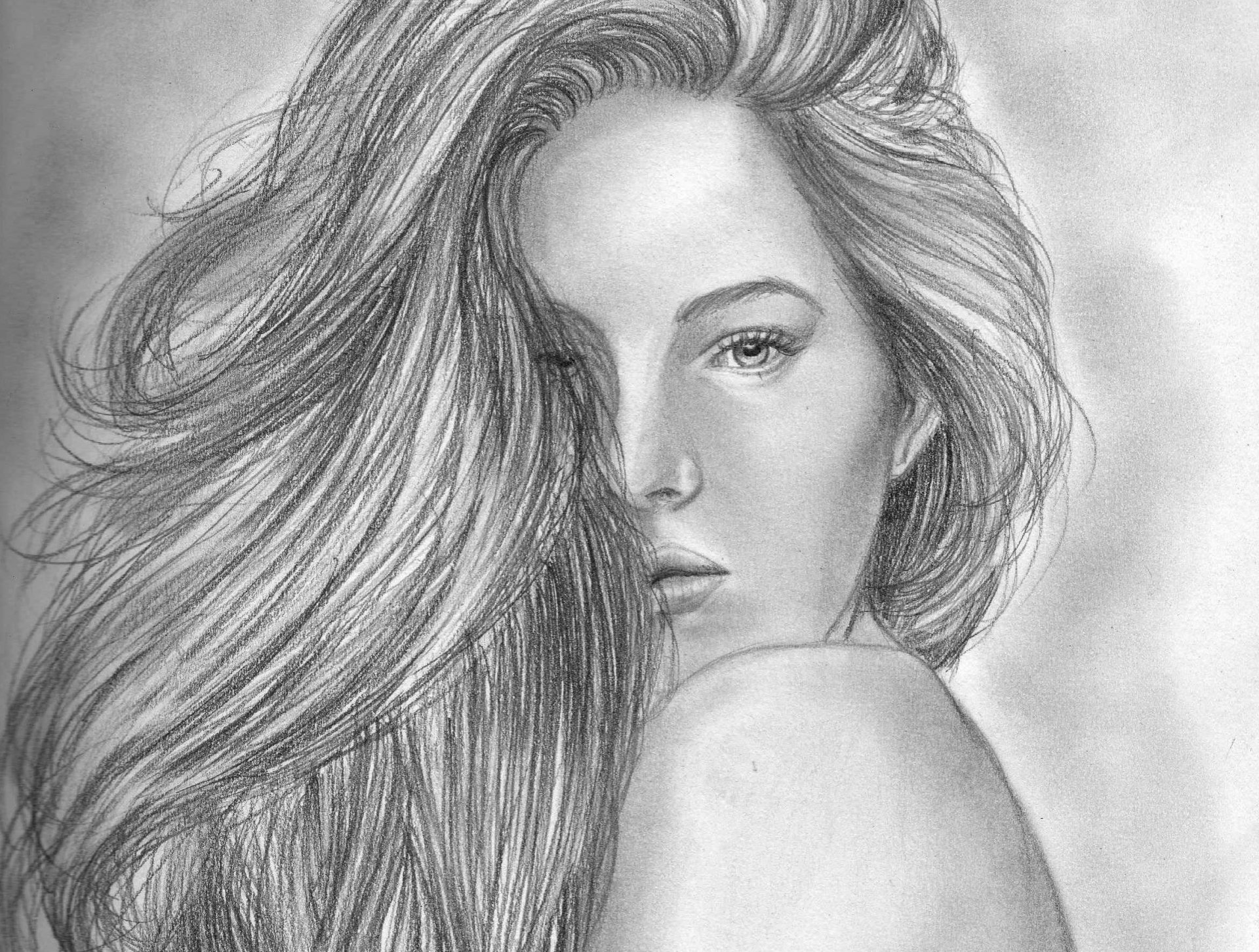 malerei bleistift mädchen gesicht blick augen haare rücken schulter