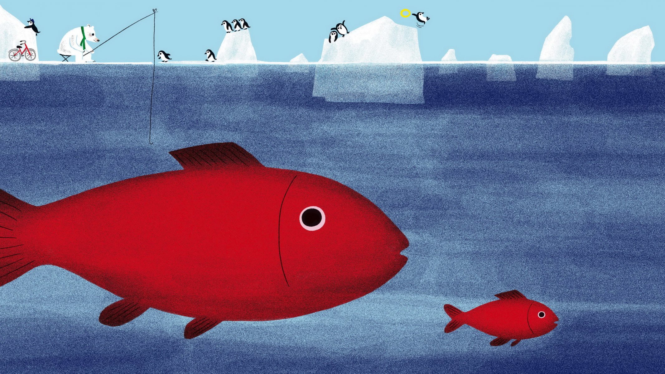 Bär mit Angelrute und riesiger roter Fisch - wallpaper für das Telefon