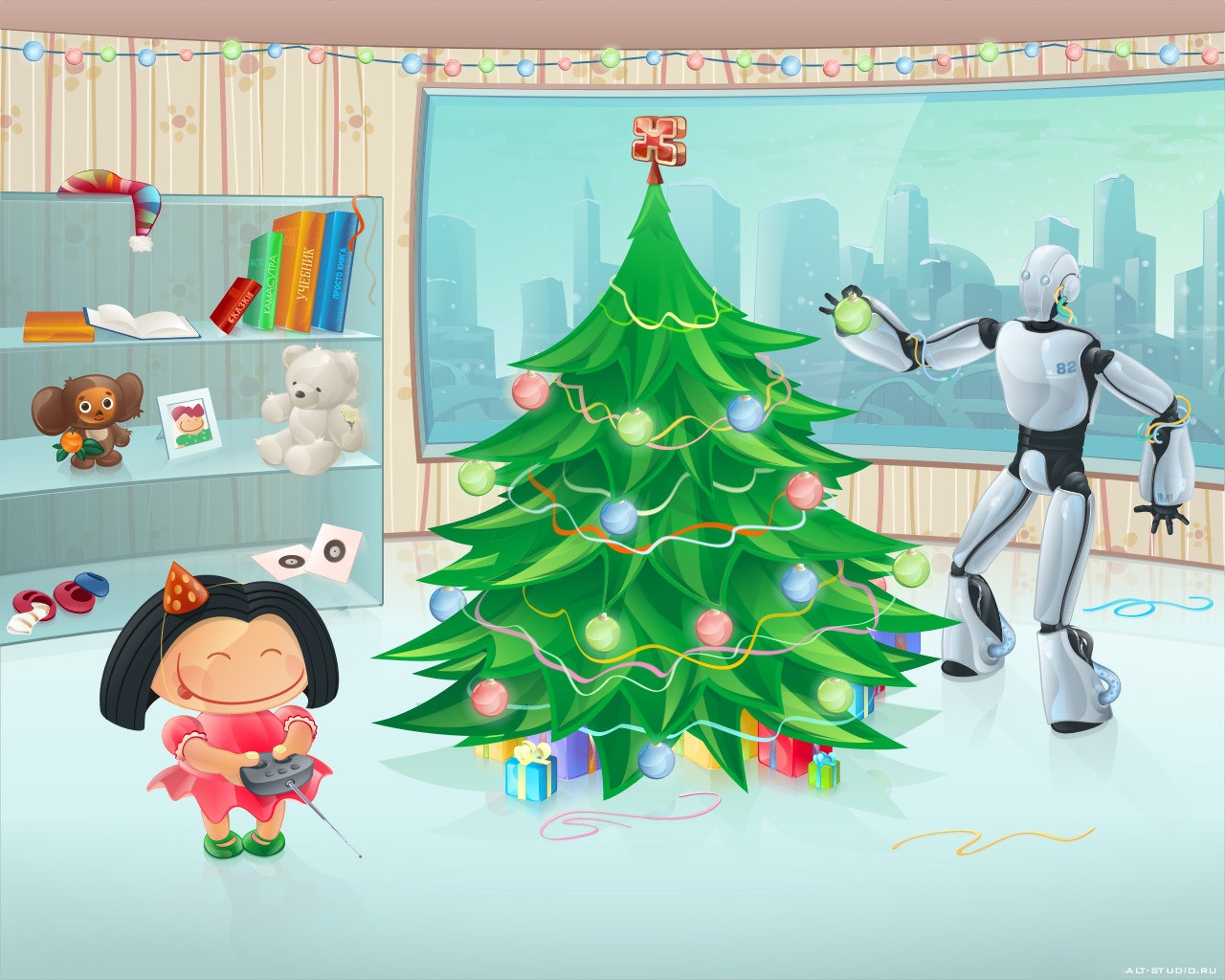 Kennungen:zeichnung, roboter, weihnachtsbaum, neujahr, mädchen