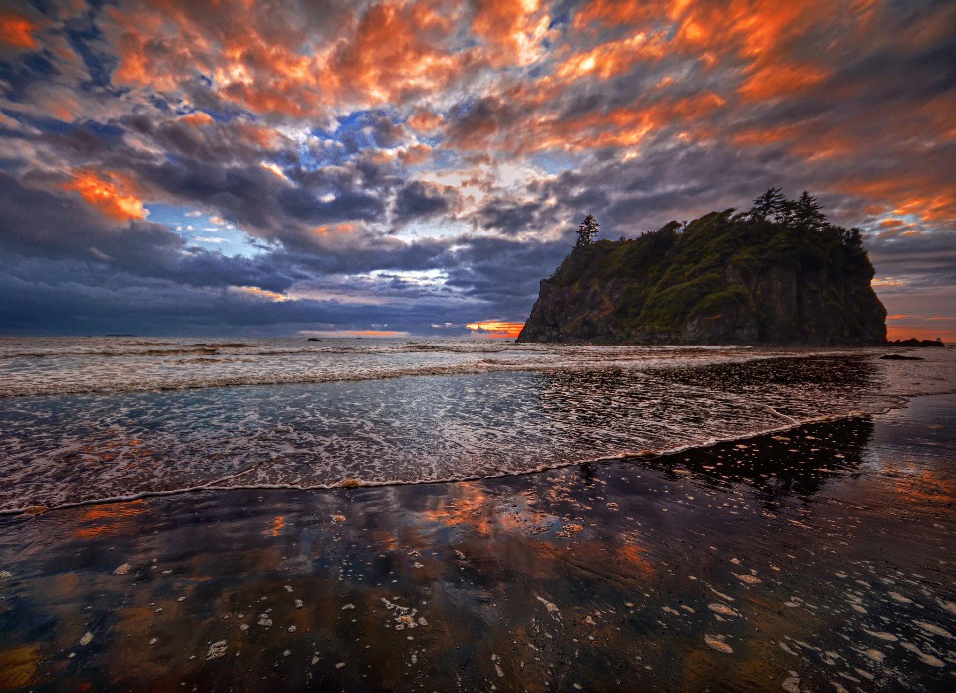 Strand vor dem hintergrund von felsen und sonnenuntergang