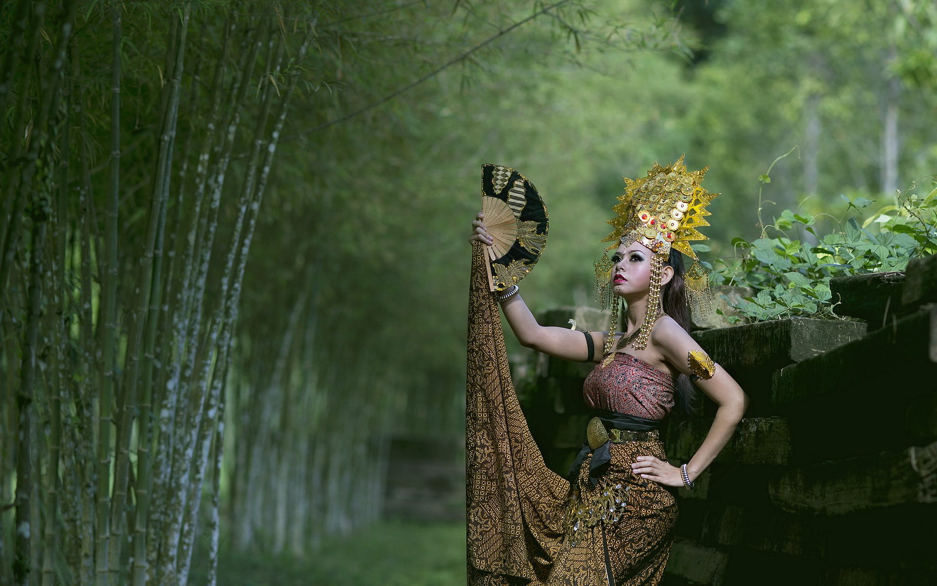 Schönes mädchen mit einem fächer auf dem hintergrund der grünen bäume