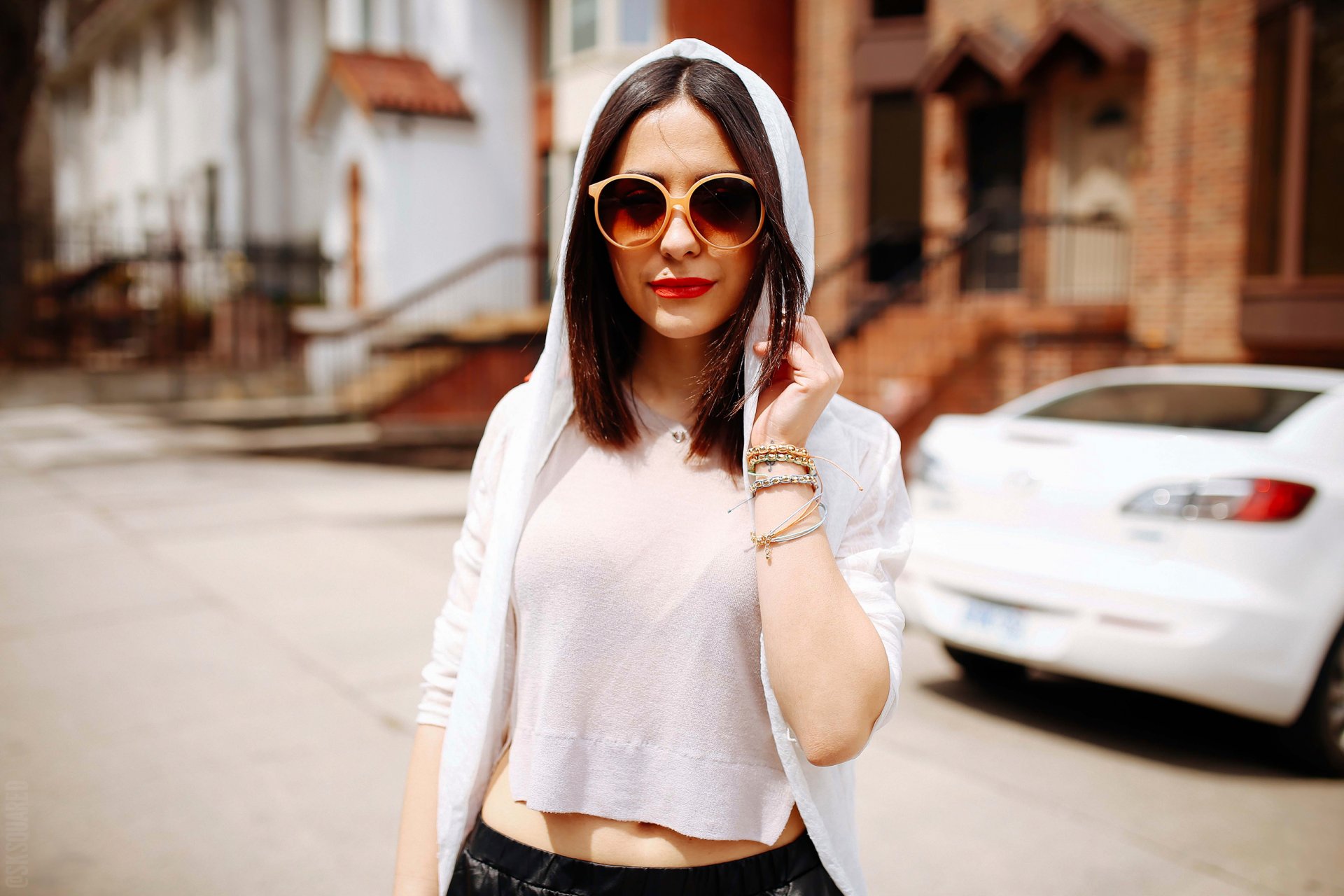 Mädchen in einer Jacke mit weißer Kapuze und dunkler Brille