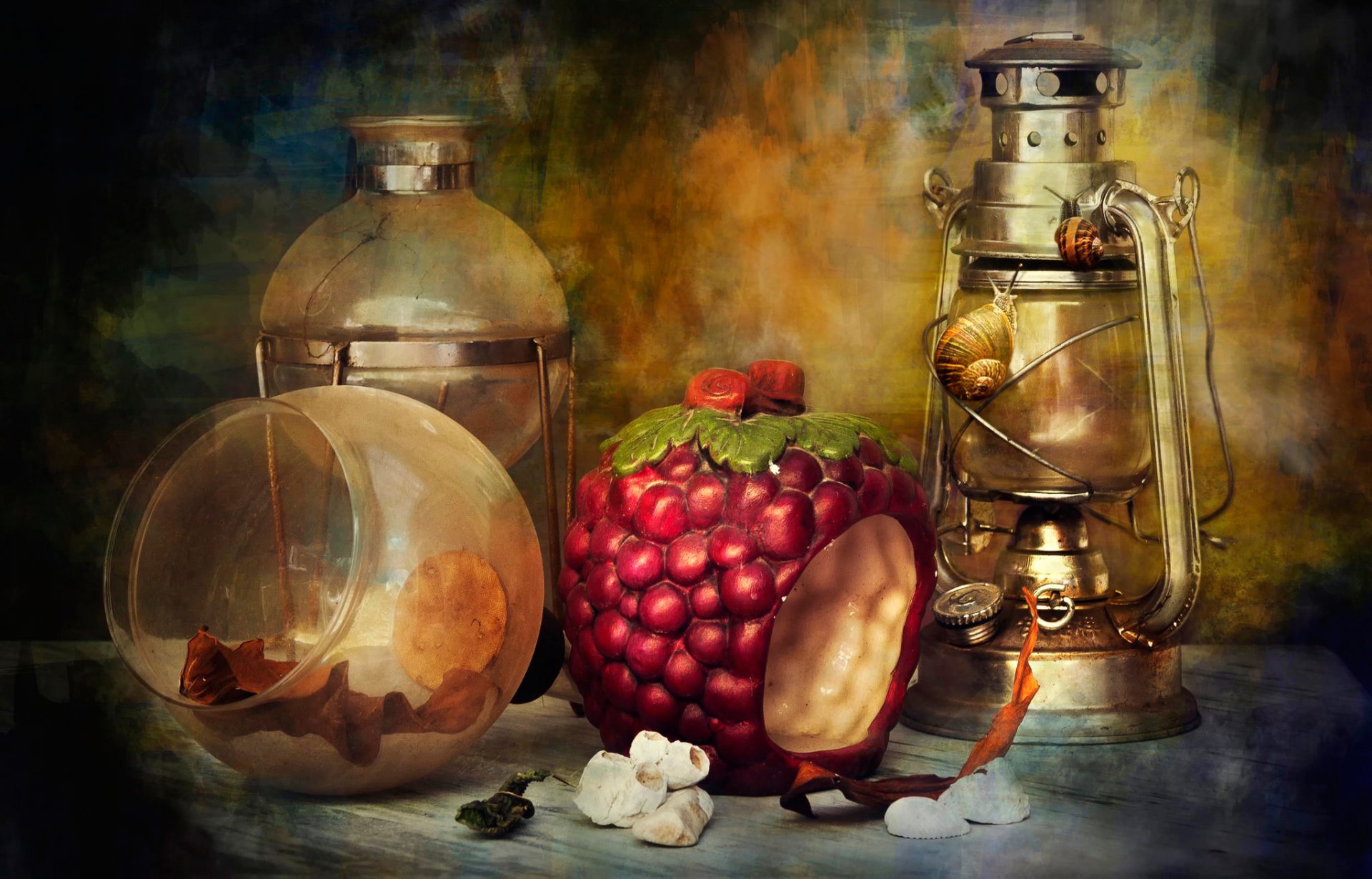 Kennungen:teekanne, lampe, schnecken, stillleben