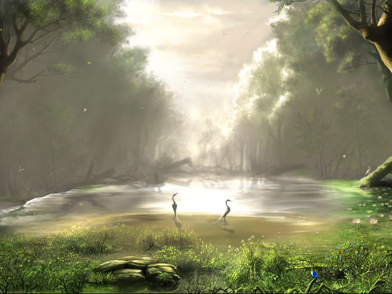 Zeichnung einer Landschaft mit Vögeln und Wald - wallpaper für das Telefon