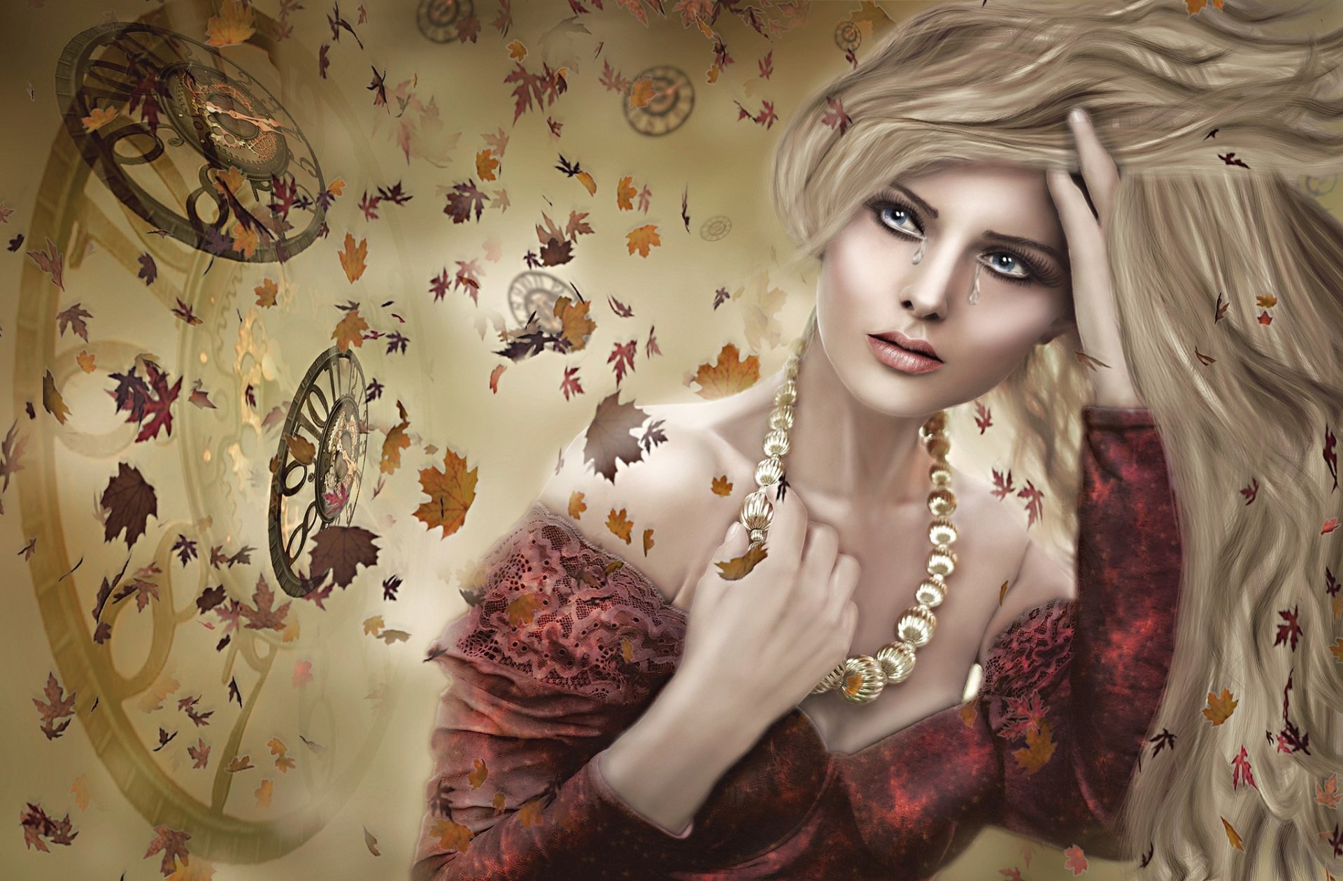 Weinendes blondes mädchen auf dem hintergrund der uhr und der blätterWeinendes blondes Mädchen auf dem Hintergrund der Uhr und der Blätter