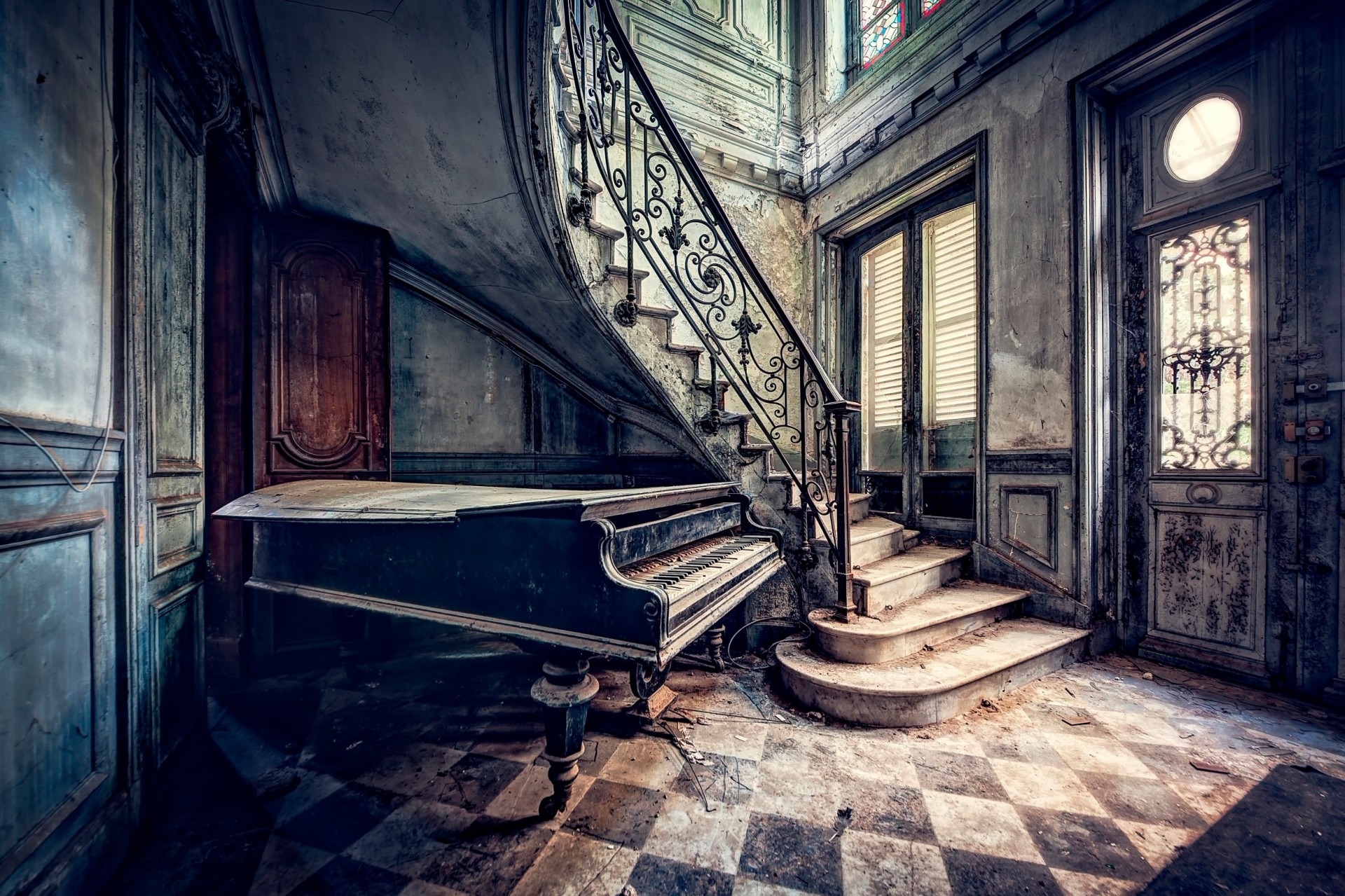 Barfüßiges mädchen steht an einem verlassenen hausBarfüßiges Mädchen steht an einem verlassenen Haus
