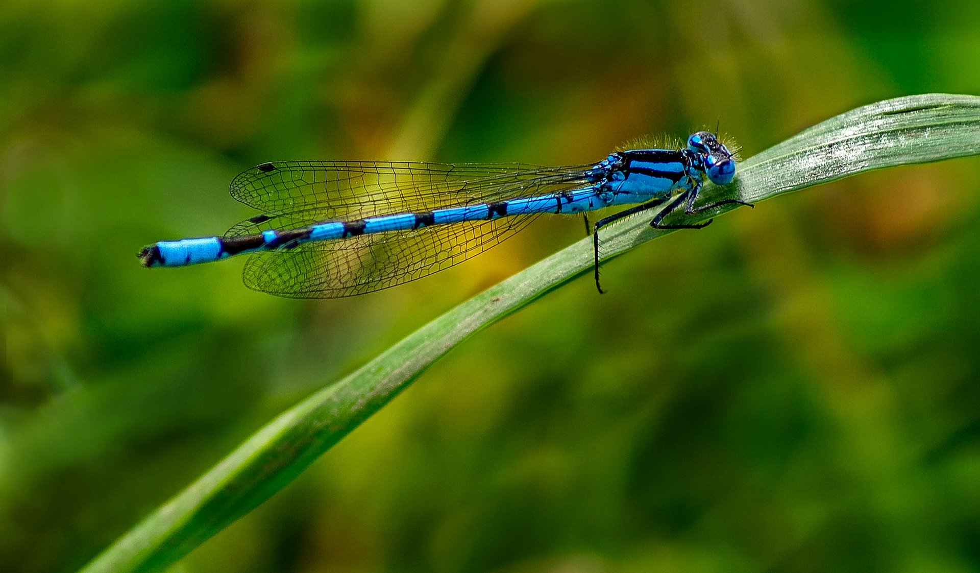 Blaue libelle auf gras auf verschwommenem hintergrundBlaue Libelle auf Gras auf verschwommenem Hintergrund