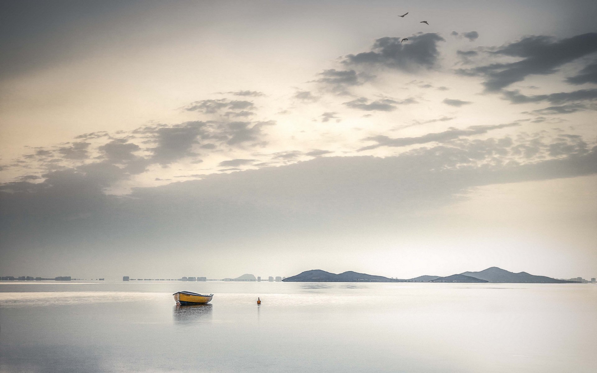 Eine landschaft mit einem boot inmitten eines sees in grauem maßstabEine Landschaft mit einem Boot inmitten eines Sees in grauem Maßstab