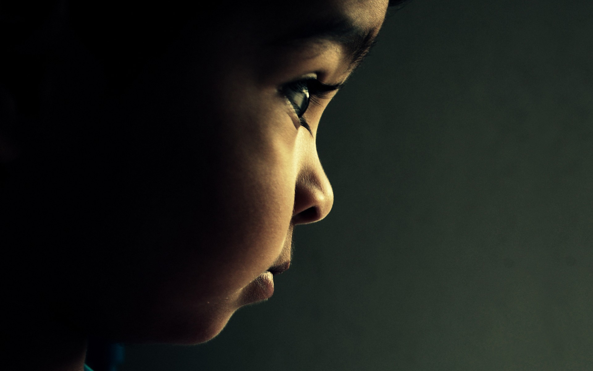 Ein Kind mit Mütze und Brille sitzt auf einem gelben Hintergrund