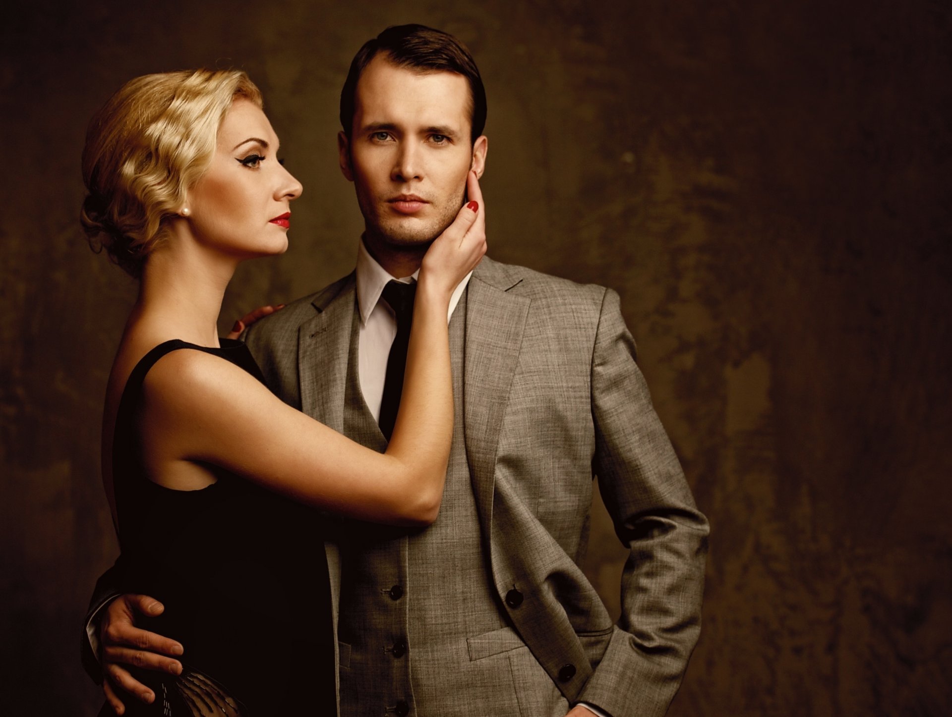 Blonde mädchen mit einem mann in einer jacke auf einem retro-fotoBlonde Mädchen mit einem Mann in einer Jacke auf einem retro-Foto