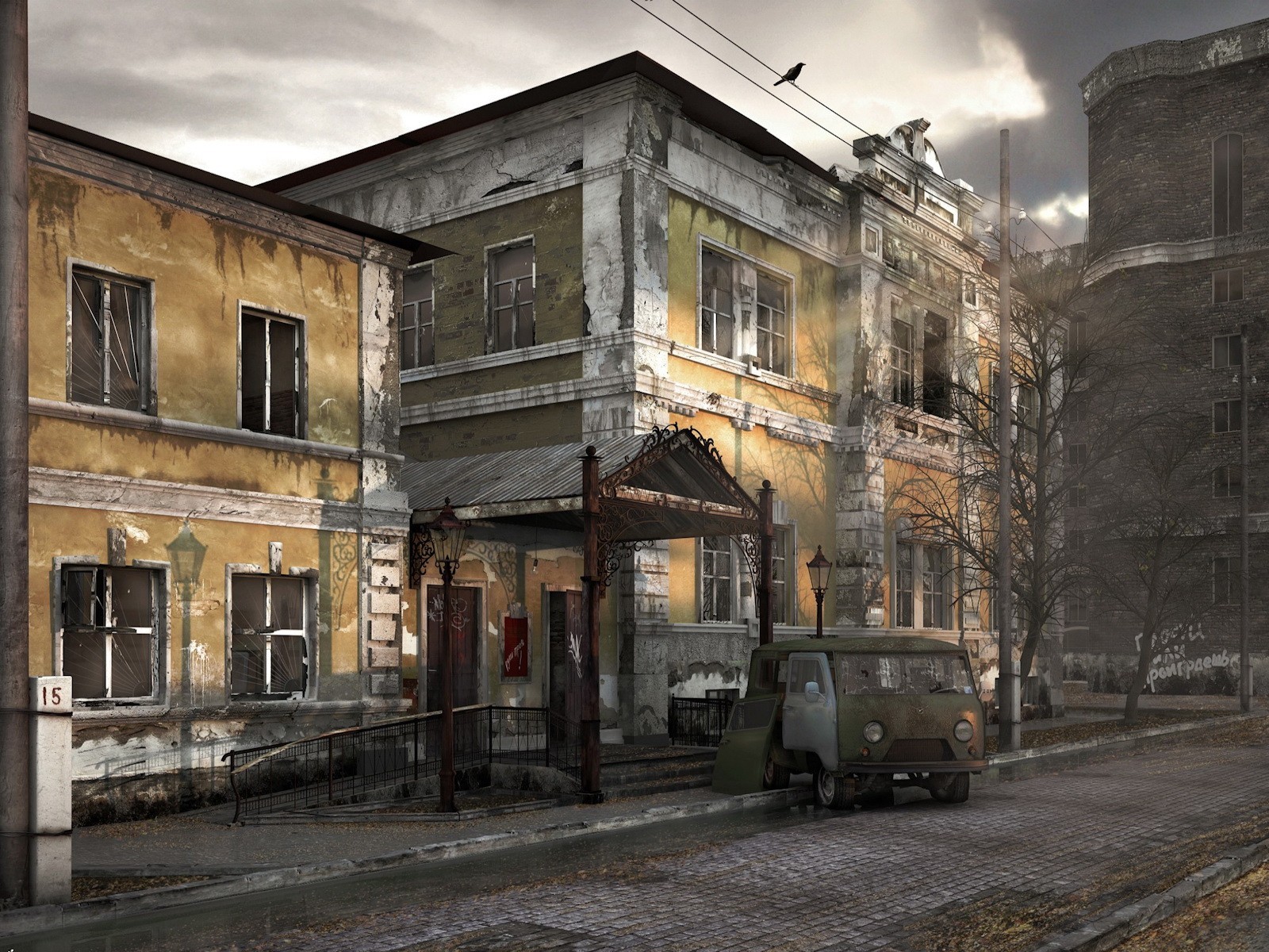 Ein altes Gebäude und ein altes Auto in der Nähe
